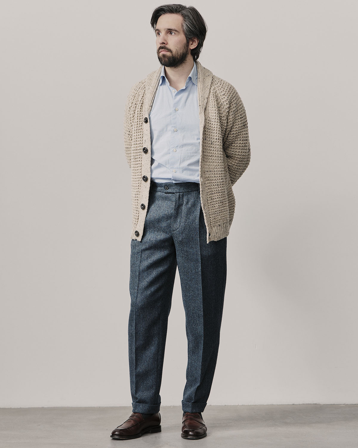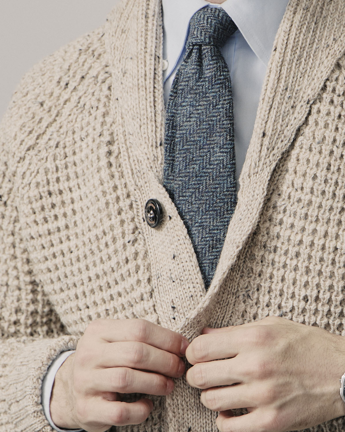 Мужской кардиган на пуговицах с шалевым воротником. Пряжа изготовлена в Великобритании из шерсти овец йоркширской породы. Основная часть выполнена вафельной вязкой, манжеты и воротник рифленые. Эту модель носит Том Харди - отсюда и её название.