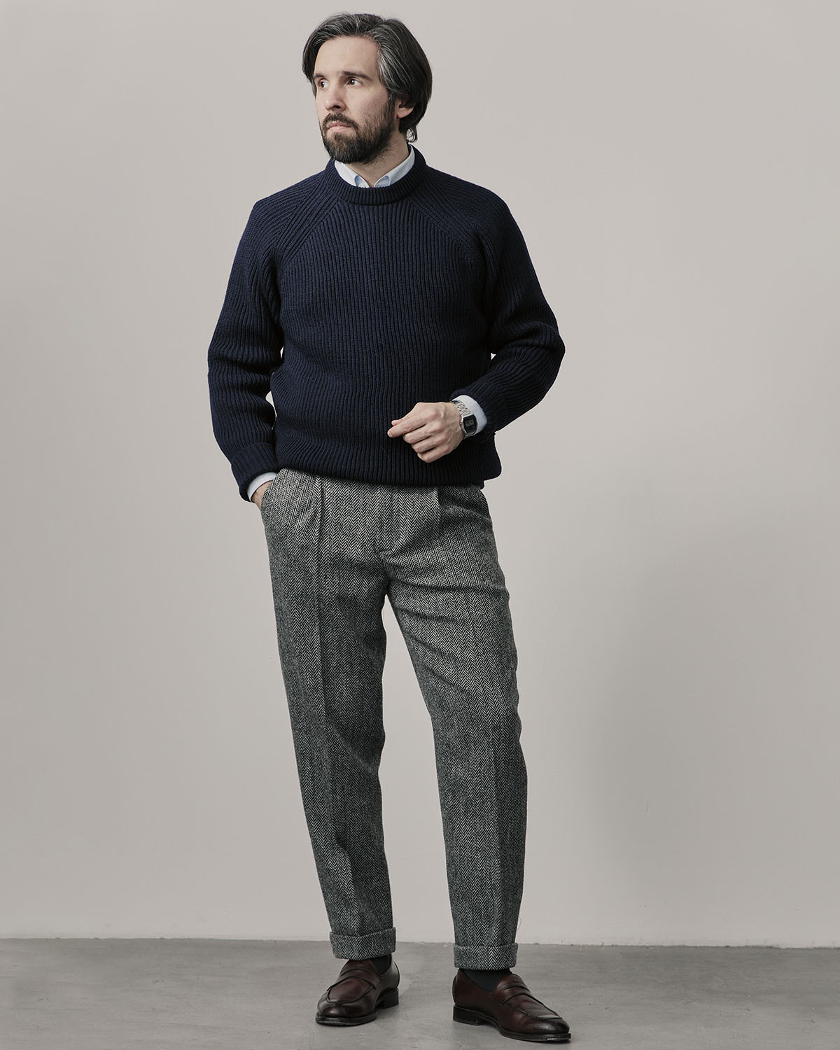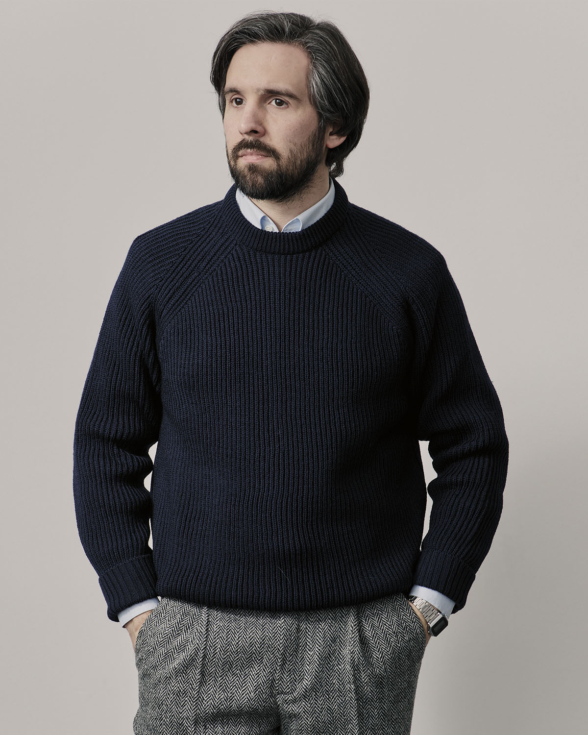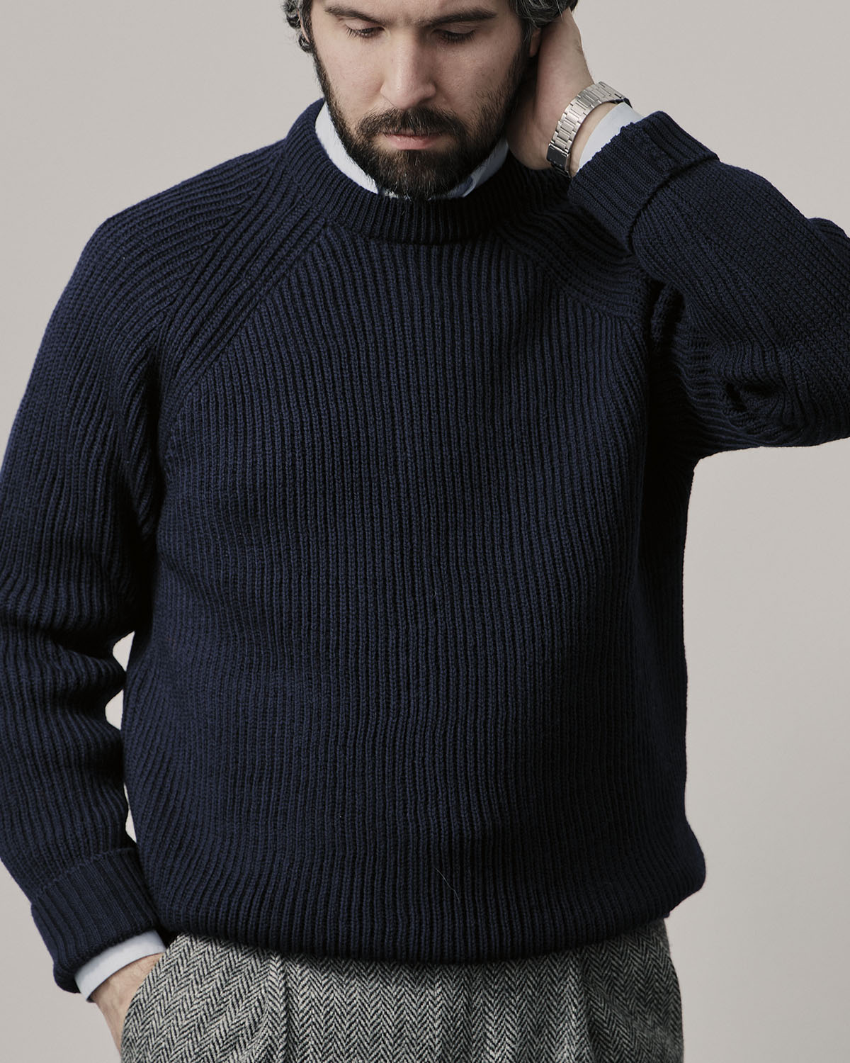 Мужской джемпер средней толщины из приятной на ощупь шерсти мериноса тёмно-синего цвета.