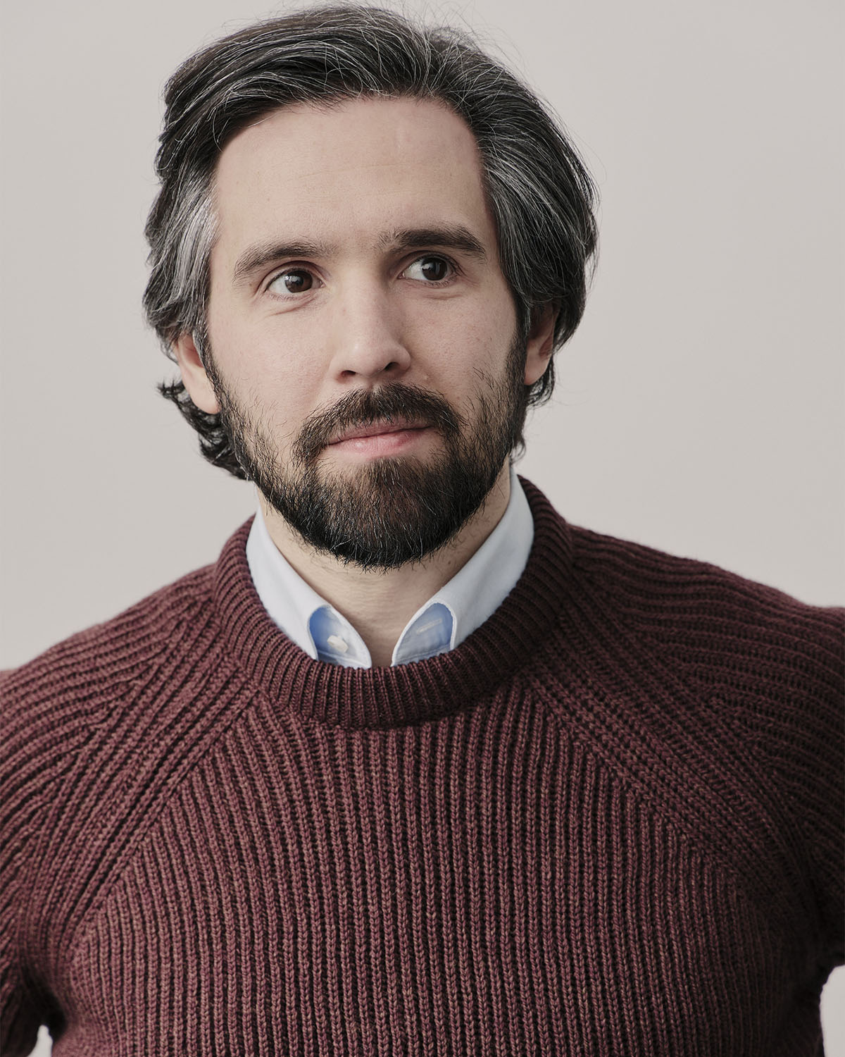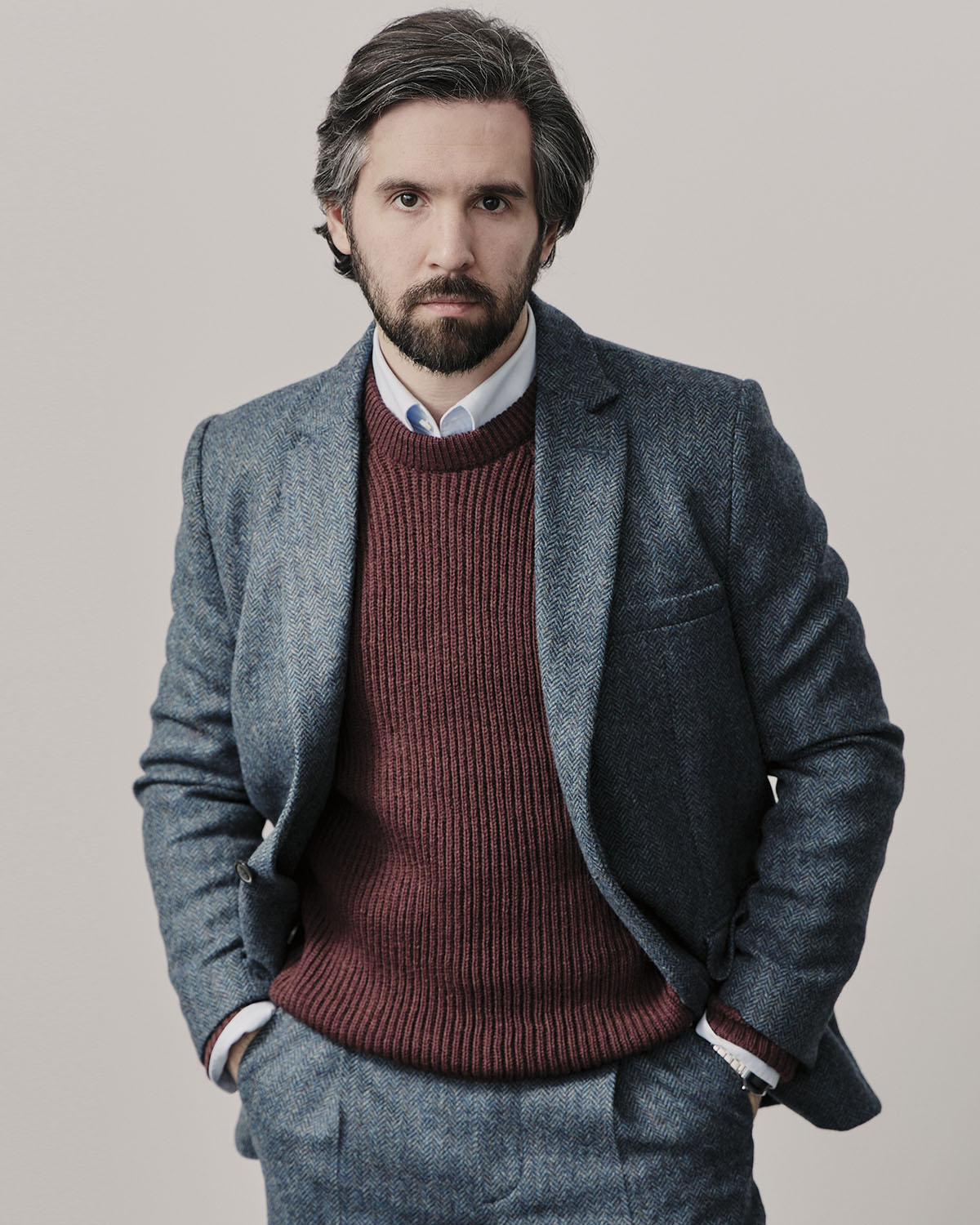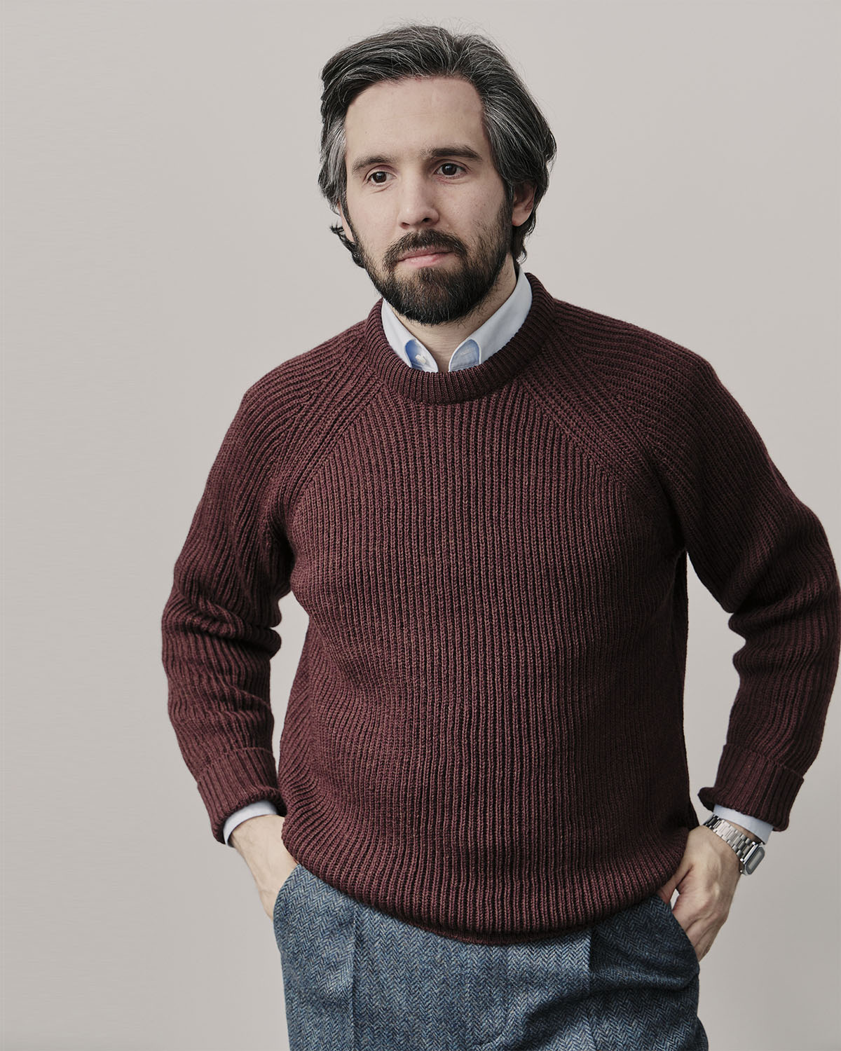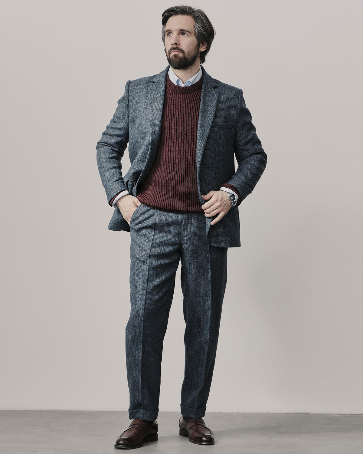 Модель ростом 178 см, размер джемпера M. На фото также представлены твидовые мужские брюки и пиджак Ocean Blue.
