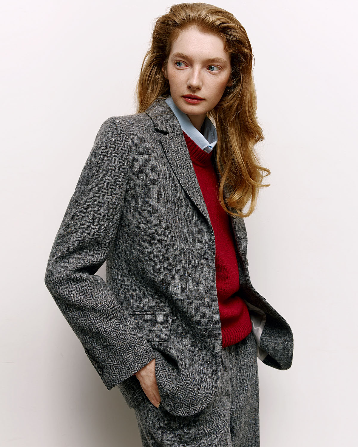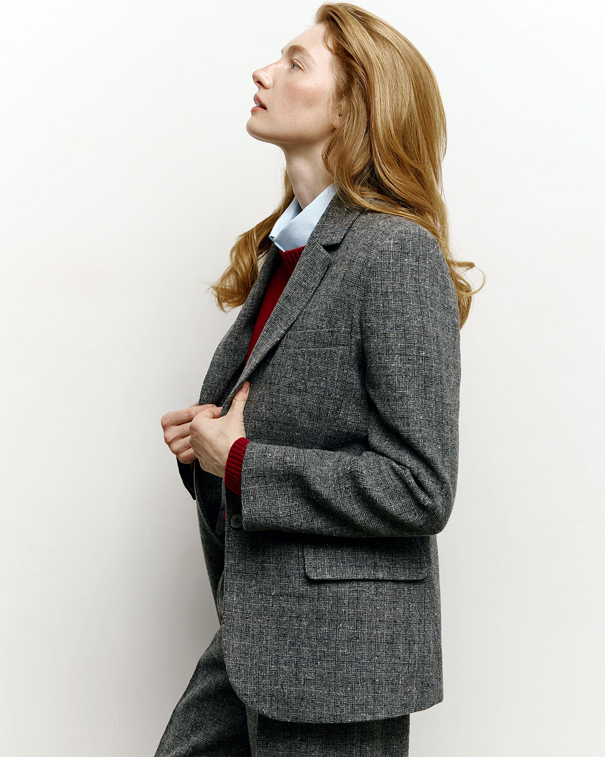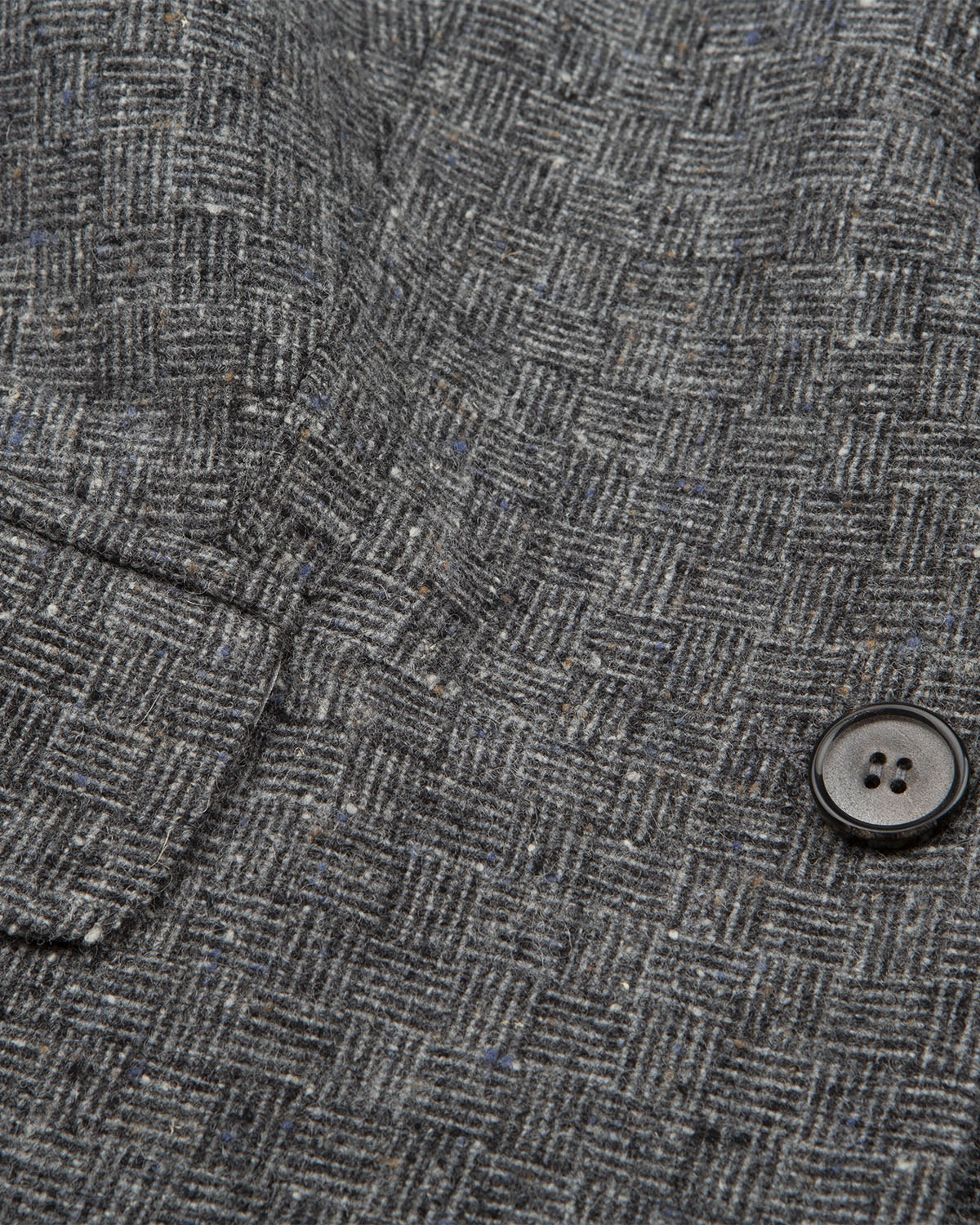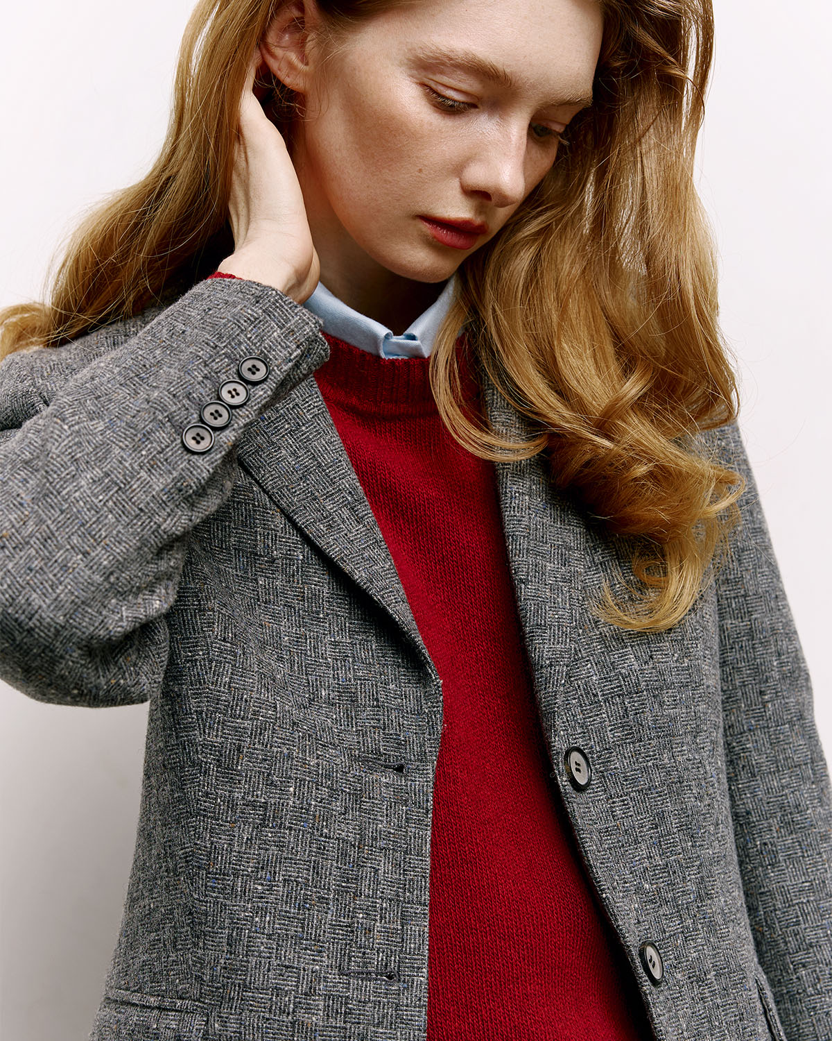 Классический женский однобортный пиджак из костюмной ткани с геометрическим узором в серых тонах, напоминающей внешнюю оболочку морской раковины, с жемчужной подкладкой из купро. Твид соткан из натуральной шерсти на небольшой семейной фабрике Molloy & Sons в деревушке Ардара, расположенной в графстве Донегол, из пряжи местного производства. Подкладка из купро изготовлена на фабрике с более чем столетней историей в Италии. Вишенка на торте нашей жемчужной раковине - пуговицы, выточенные из натурального рога в Германии.