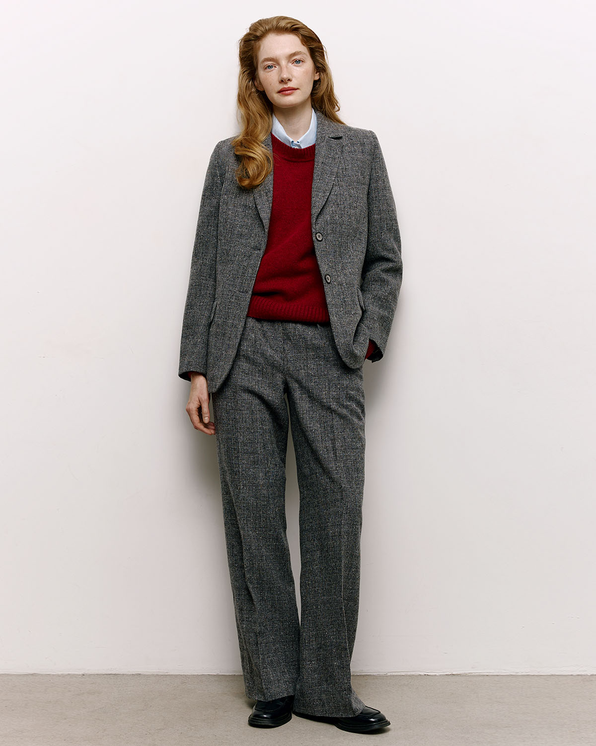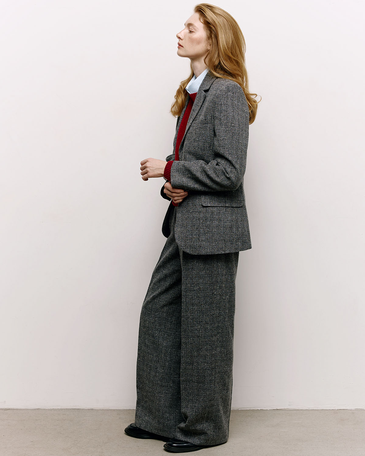 Модель ростом 171 см, размер S. На фото также представлены шерстяные брюки из этой же ткани,