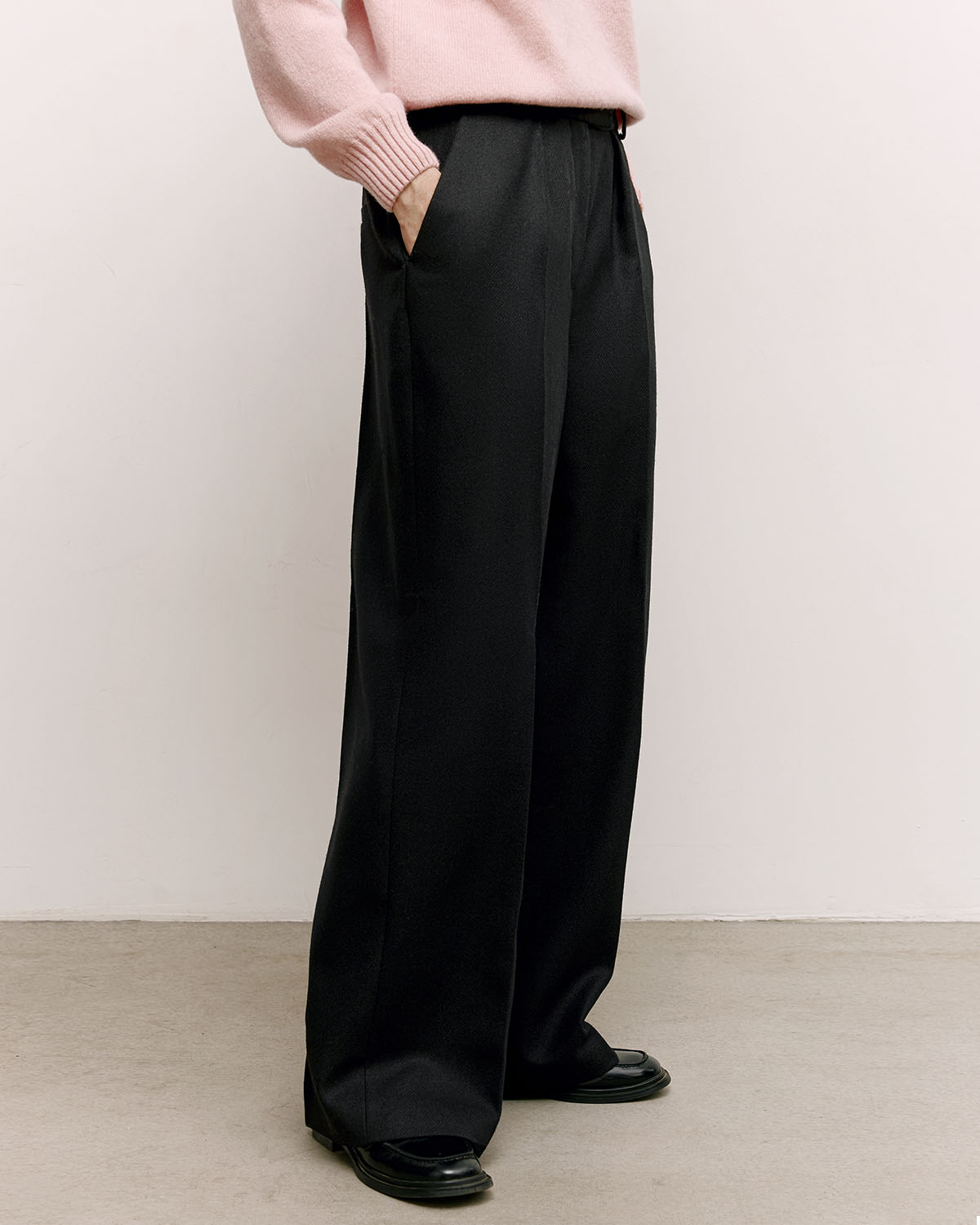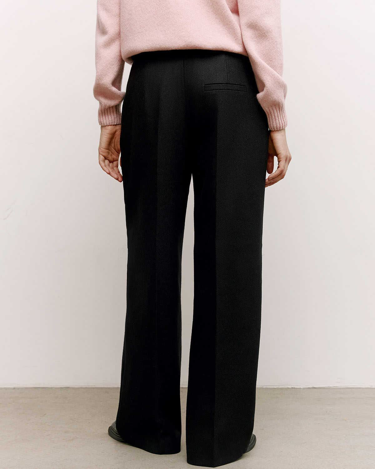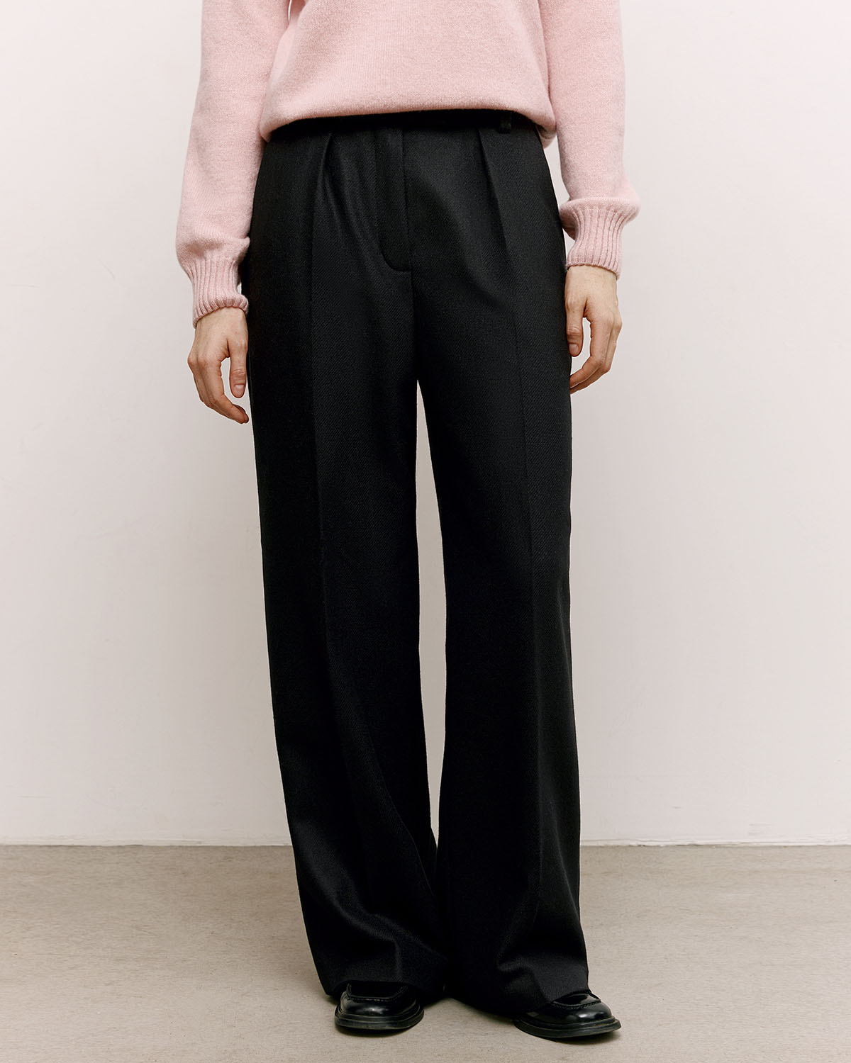Прямые женские брюки без манжета из костюмного твила ровного чёрного цвета. Ткань соткана из мягкой шерсти ягнёнка мериноса в Англии на фабрике Abraham Moon & Sons, чья история началась в 1837 году. Подкладка из купро выполнена во всю длину.