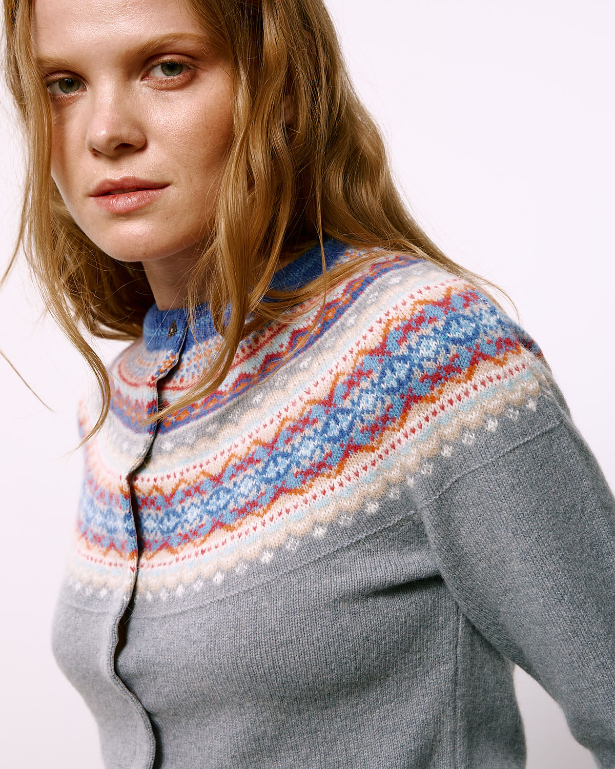 Уютный кардиган из нежной шерсти ягнёнка с добавлением ангоры в области узоров.
