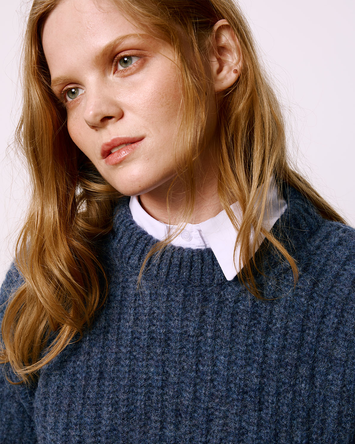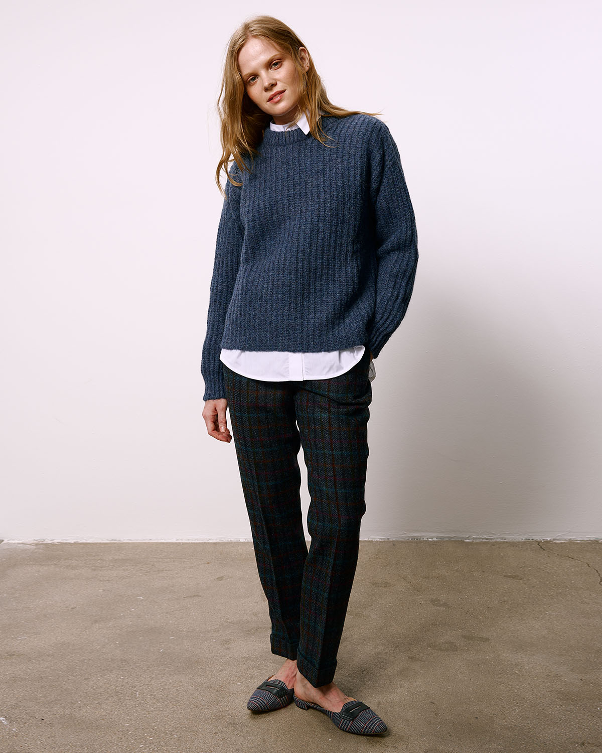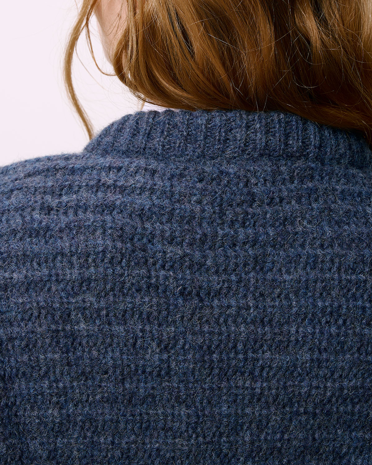 Достаточно толстый и плотный джемпер с круглым воротником, приспущенным плечом и удлиненной спинкой. Связан из очень мягкой и лёгкой пряжи в синих тонах, изготовленной из шерсти альпаки и высокогрных перуанских овец.