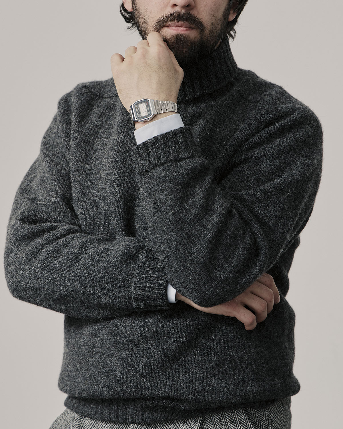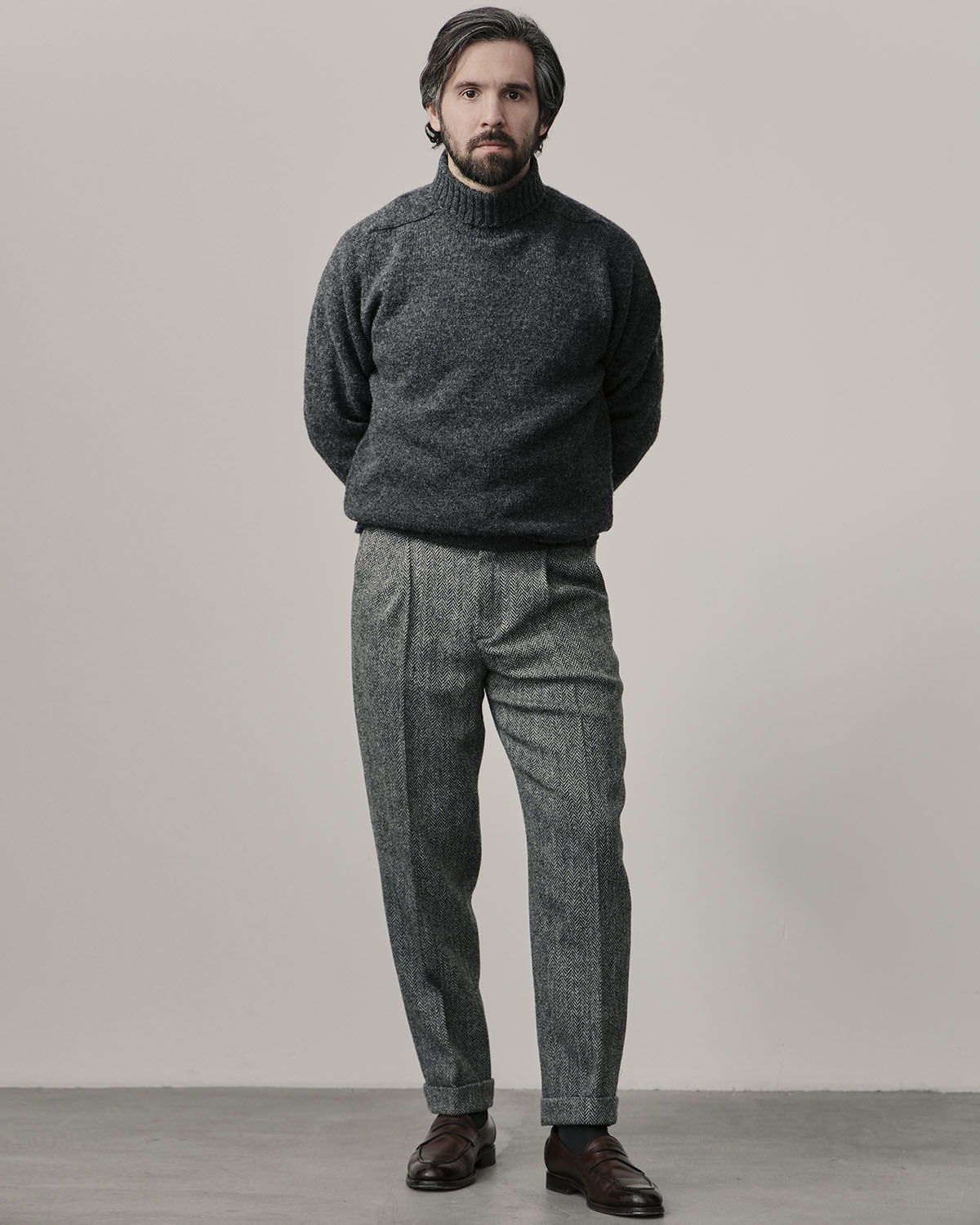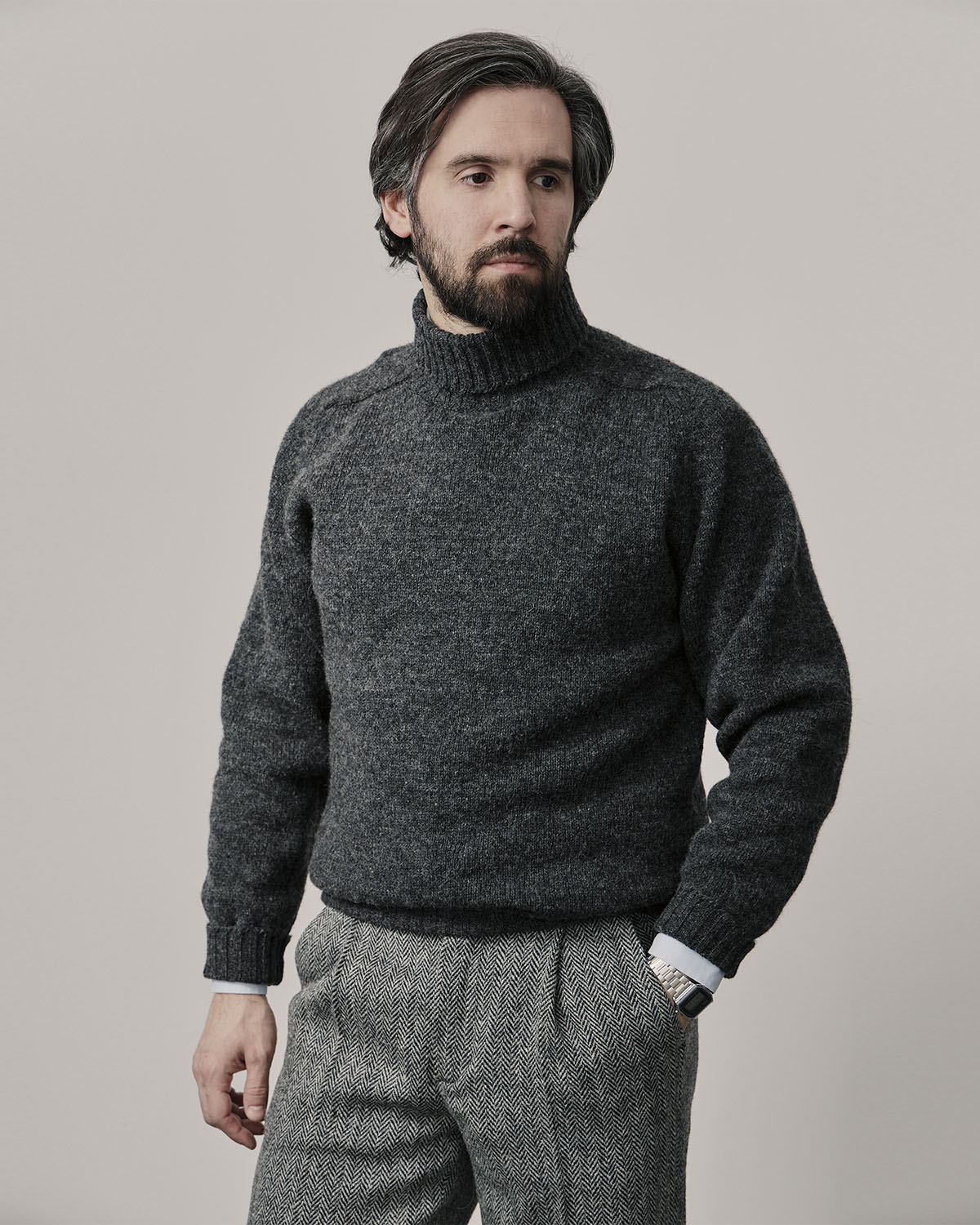 Шерстяной свитер гладкой вязки графитового цвета, не толстый, но тёплый. Связан на небольшой семейной фабрике Jamieson's of Shetland, расположенной на архипелаге в Атланитическом океане - самой северной части Шотландии.