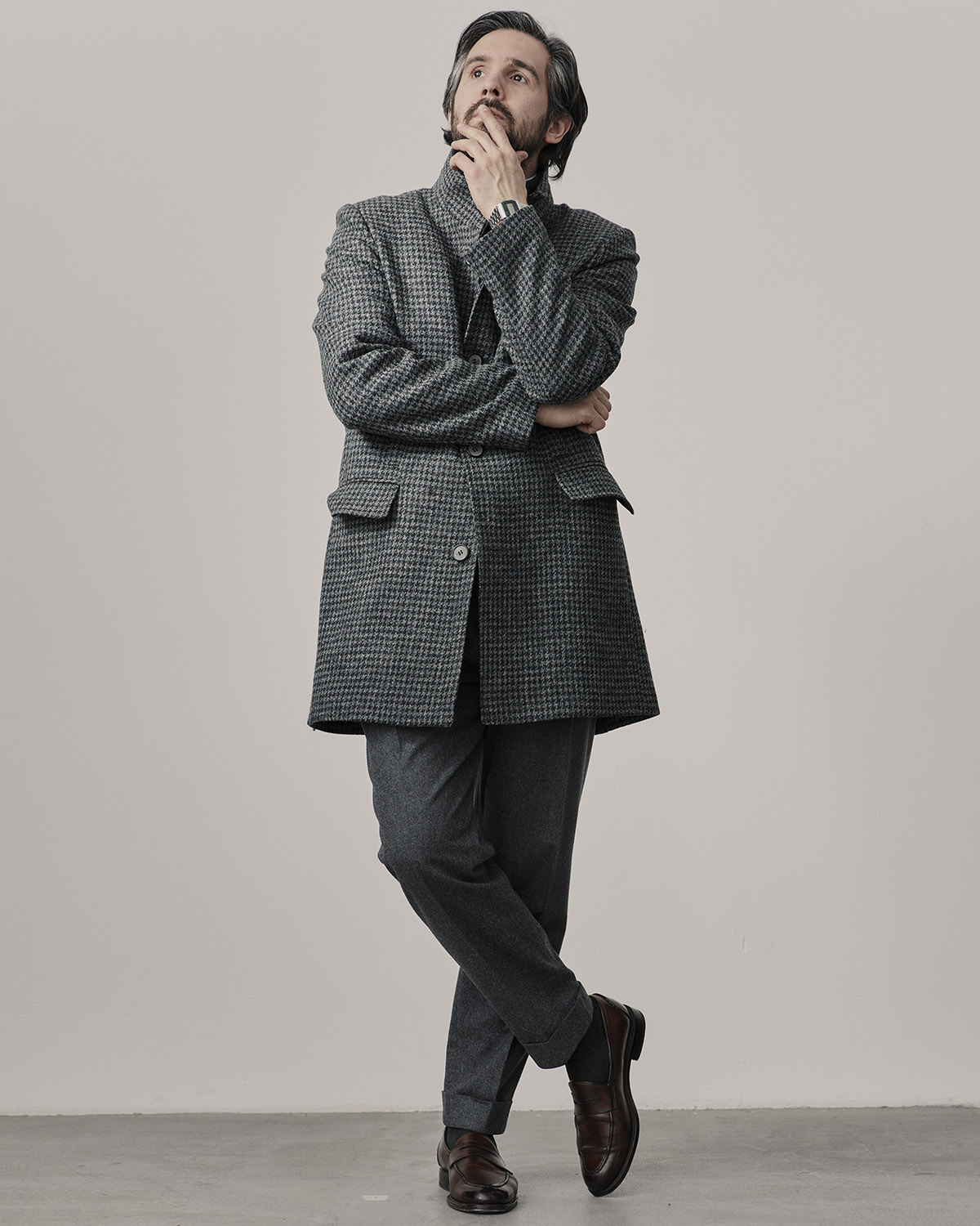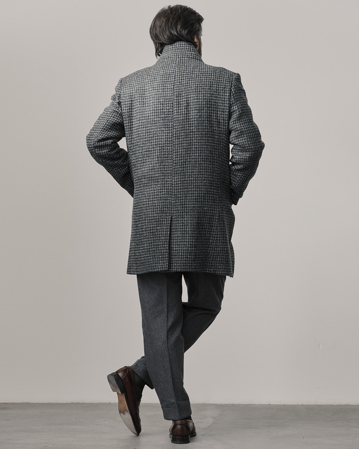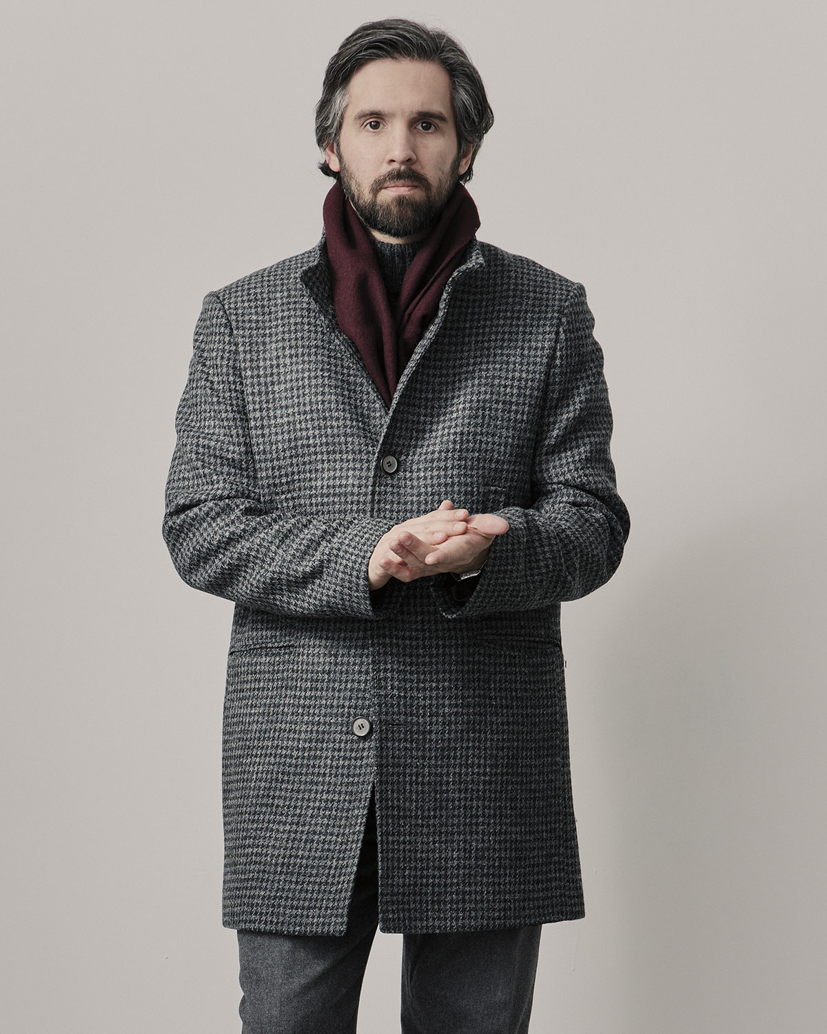 Классическое мужское пальто из настоящего Харрис Твида с рисунком "зуб гончей" (он же гусиная лапка) в сером и угольном тонах. Ткань соткана из натуральной овечьей шерсти на ручных станках жителями Внешних Гебридских островов. Подкладка выполнена из дышащей ткани купро цвета асфальта. Рисунок ткани органично дополняют пуговицы из натурального рога с комбинированной полированной чёрной и матовой серой финишной отделкой.