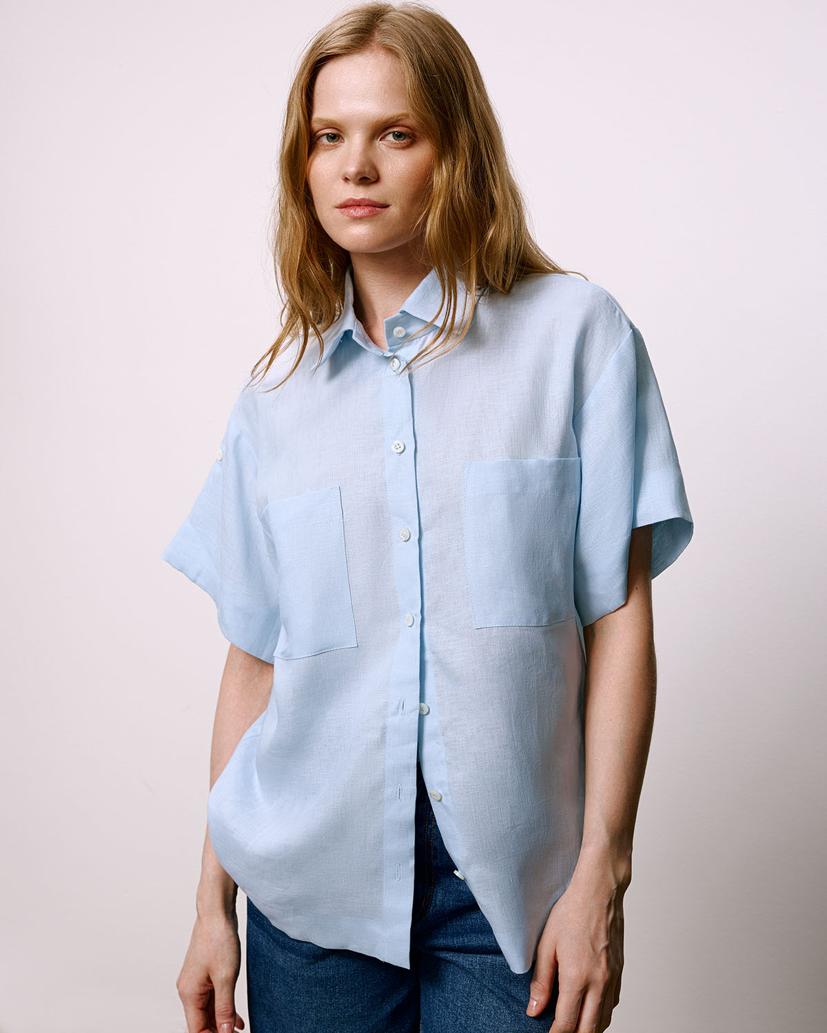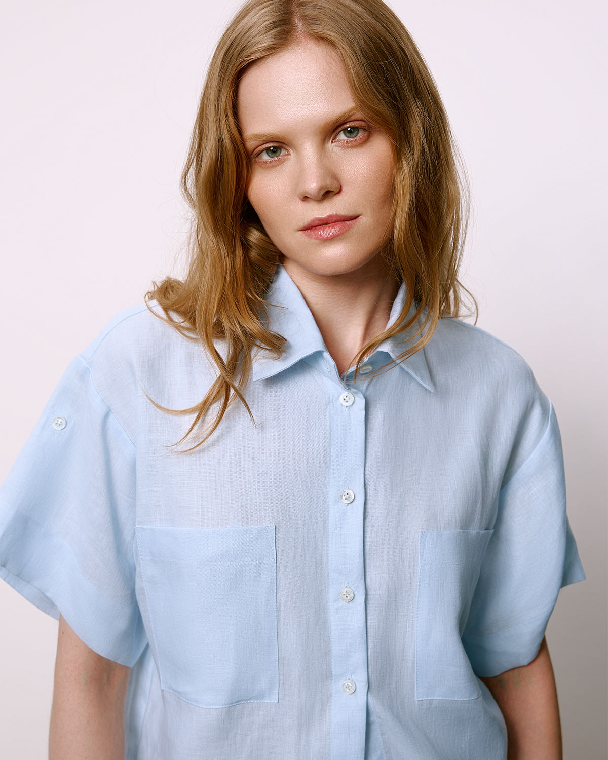 Лёгкая женская рубашка прямого свободного кроя с коротким рукавом. Сшита из качественной ирландской льняной ткани нежно-голубого цвета. Ткань соткана из бельгийского льна и окрашена в Северной Ирландии на фабрике Baird McNutt, которая работает с 1912 года. Перламутровые пуговицы толщиной в 3.5 мм изготовлены из австралийских раковин и пришиты вручную.