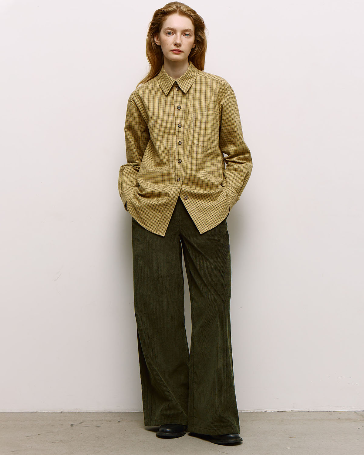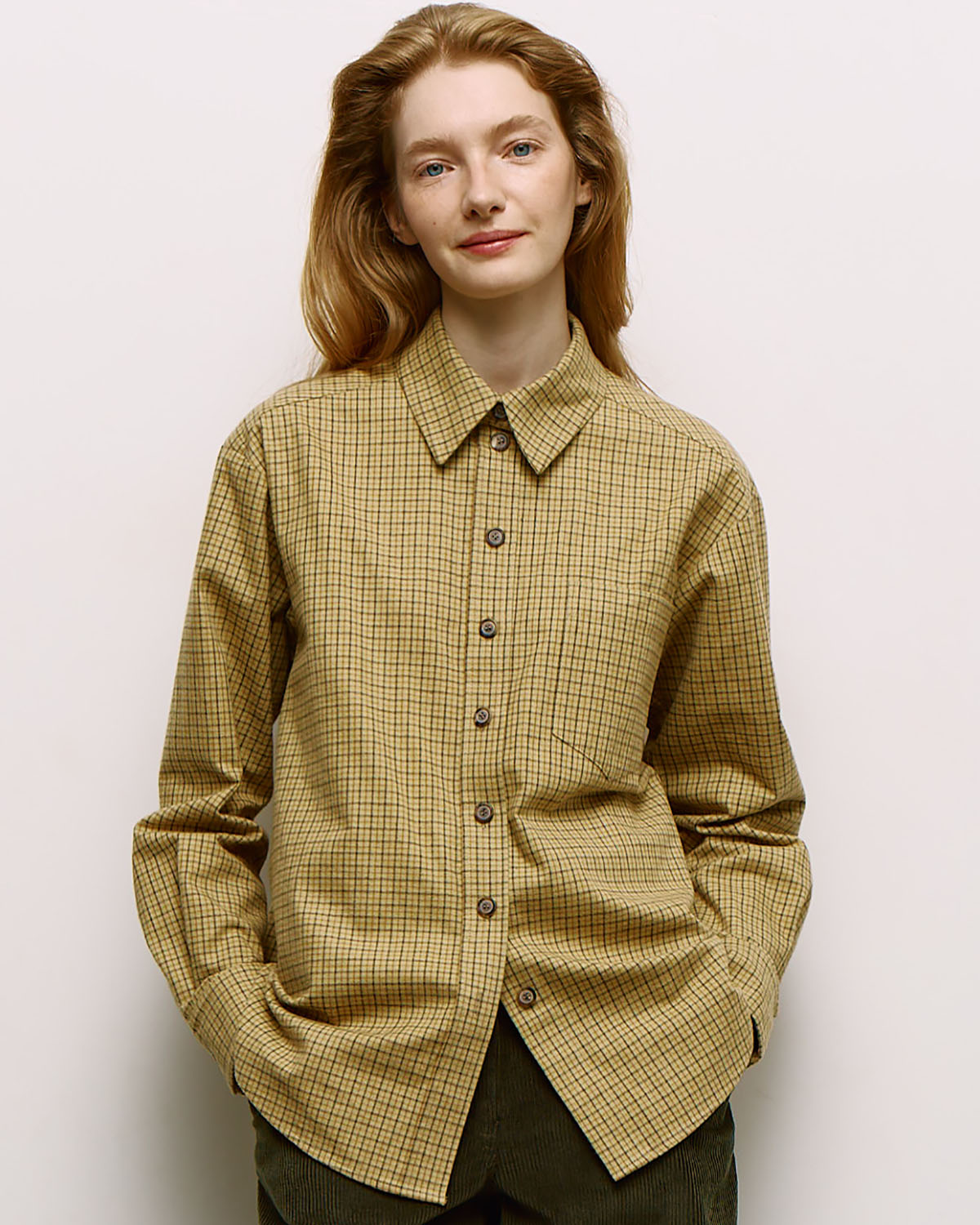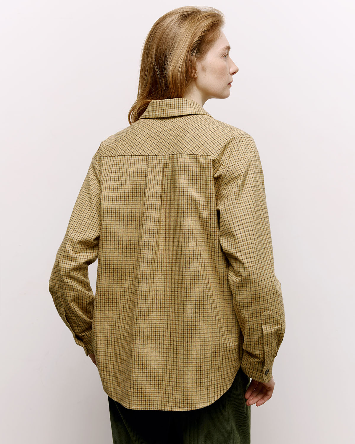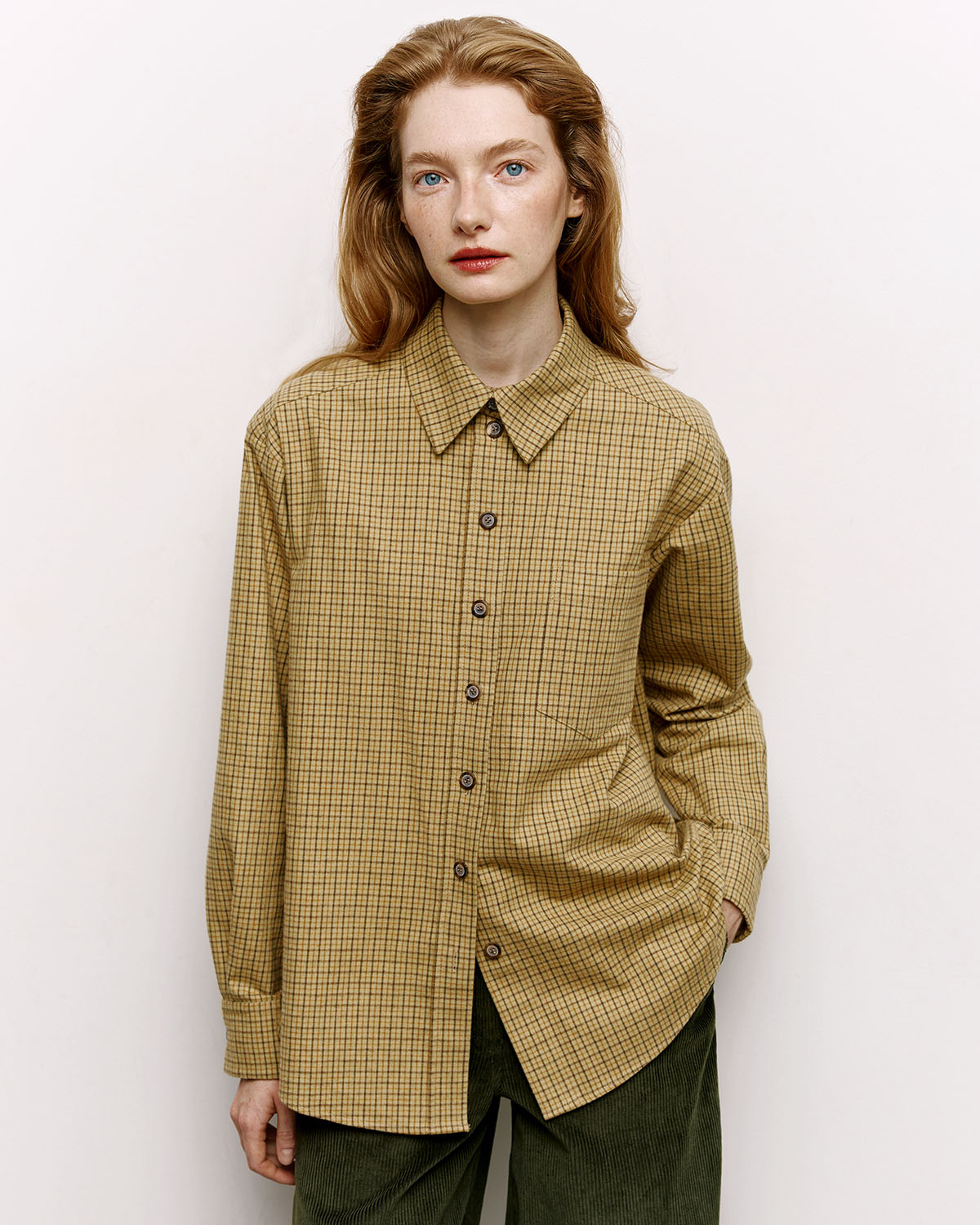Свободная женская рубашка песочного цвета в тонкую клетку коричневых тонов. Сшита в Москве из мягкой японской фланели, сотканной из натурального хлопка в префектуре Хиого на фабрике, чья история началась в первой половине 20 века. Фурнитура подобрана созвучно ткани: кремово-коричневые пуговицы с комбинированной глянцевой и матовой отделкой, изготовленные из натурального рога водяного буйвола в Германии.
