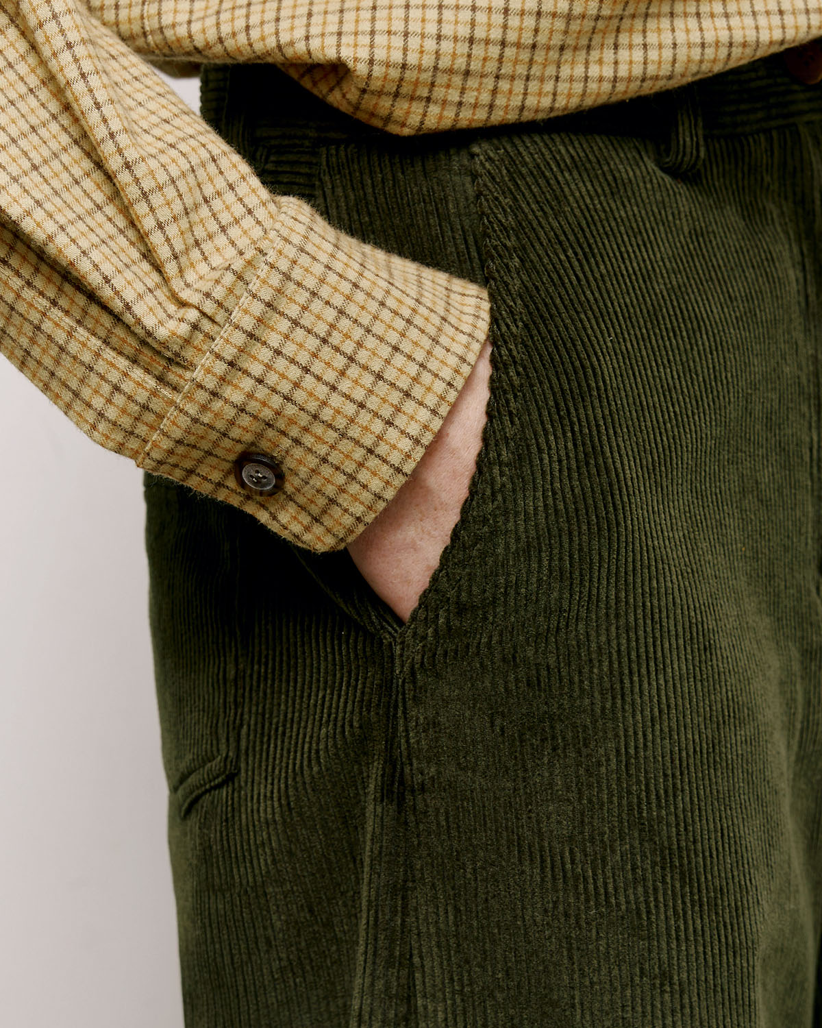На фото также представлены женские брюки из японского вельвета тёмно-оливкового цвета. Модель ростом 171 см, размер S.