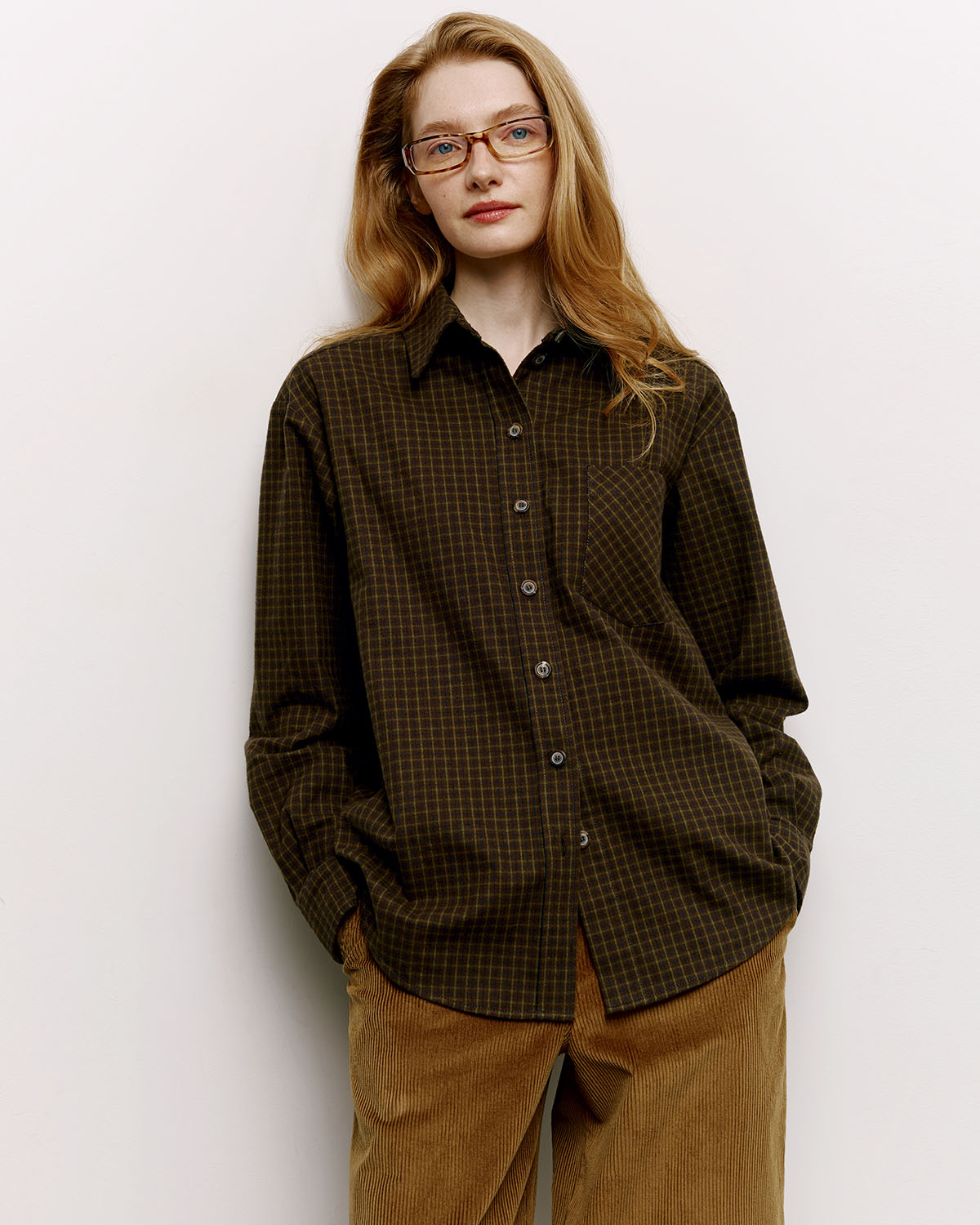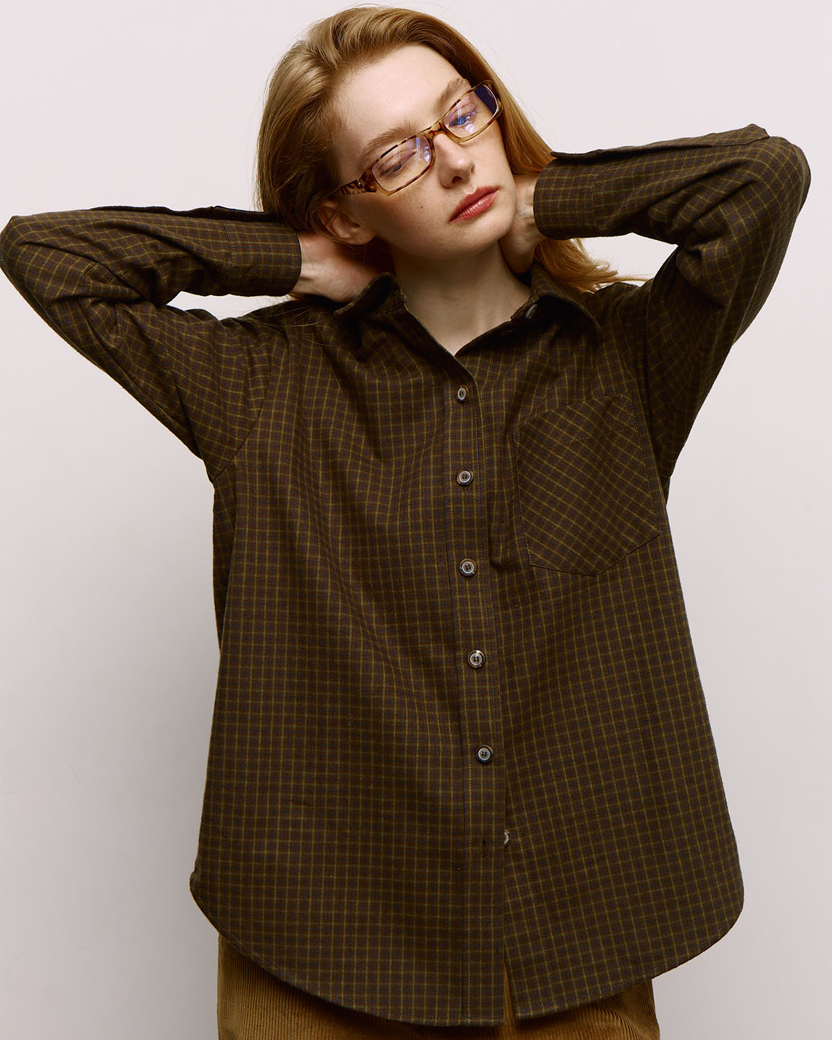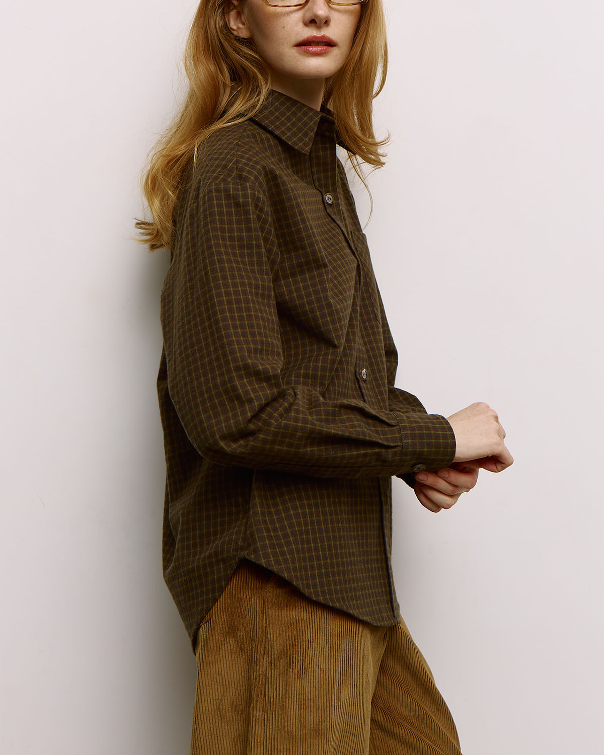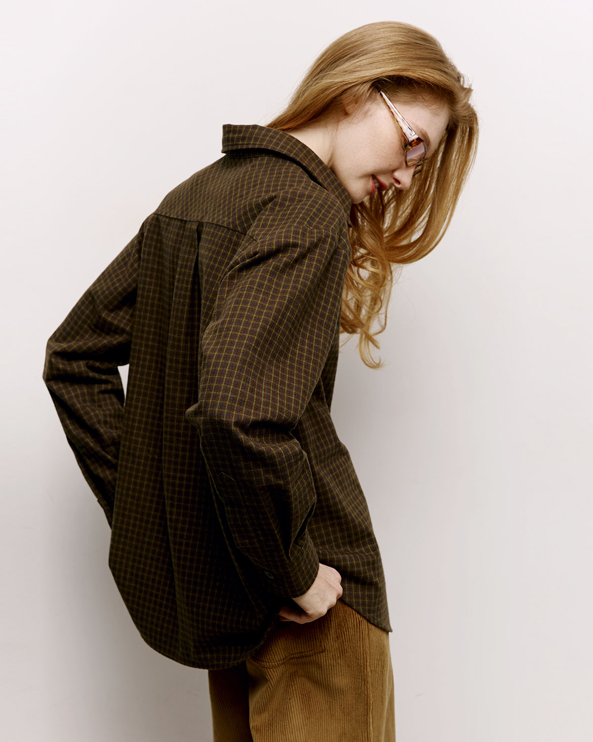 Свободная женская рубашка тёмно-зелёного цвета в тонкую клетку оливкового и тёмно-синего цвета. Сшита в Москве из мягкой японской фланели, сотканной из натурального хлопка в префектуре Хиого на фабрике, чья история началась в первой половине 20 века. Фурнитура подобрана созвучно ткани: кремово-коричневые пуговицы с комбинированной глянцевой и матовой отделкой, изготовленные из натурального рога водяного буйвола в Германии.