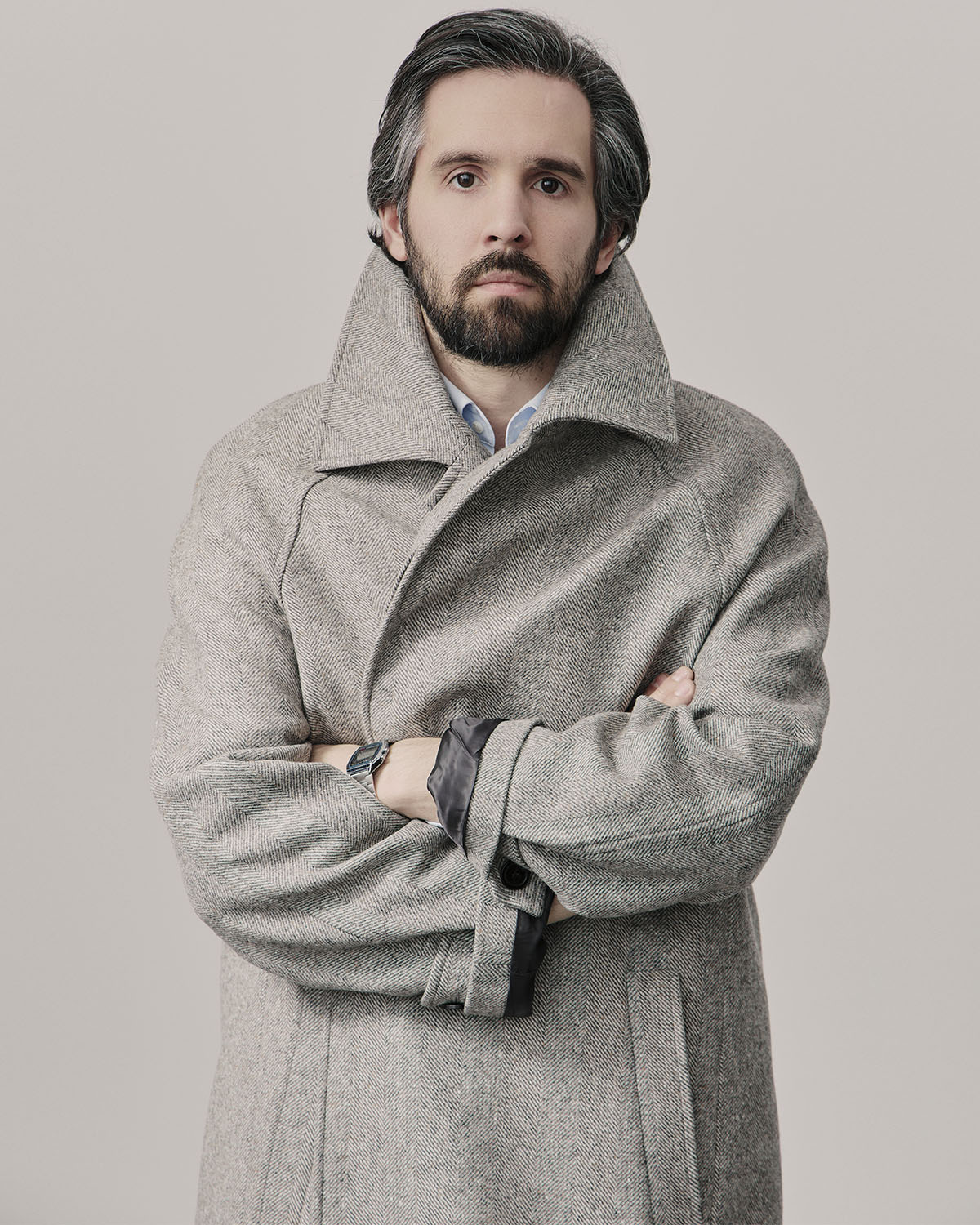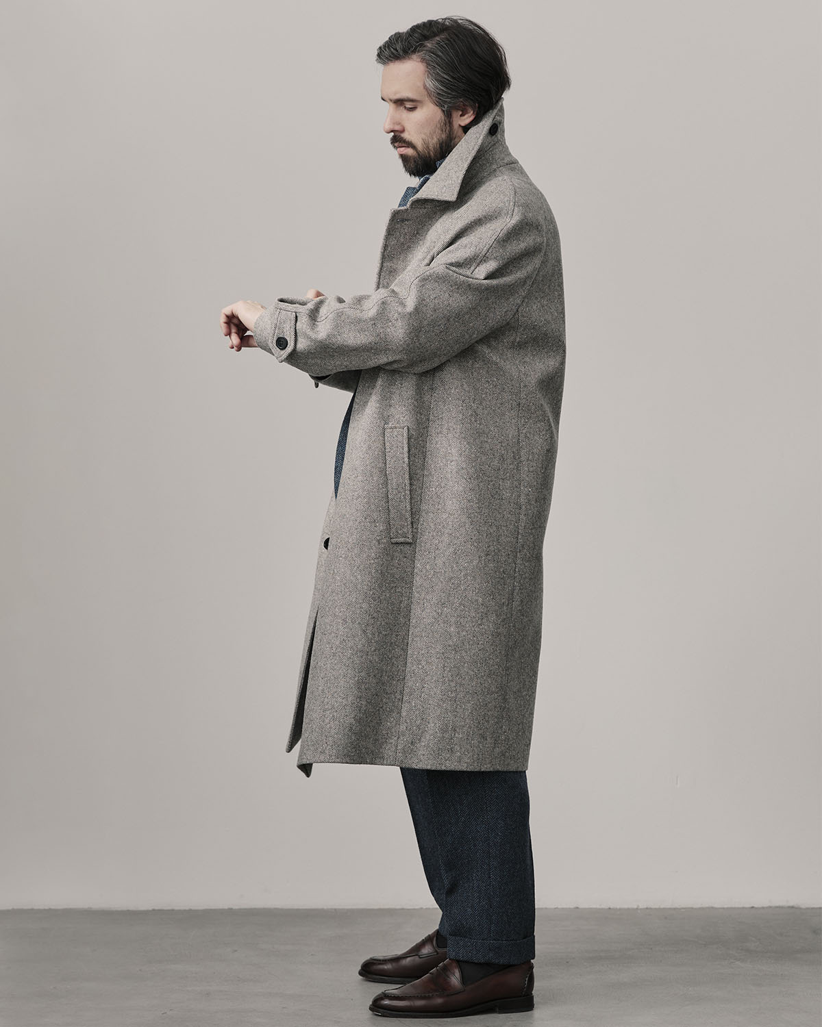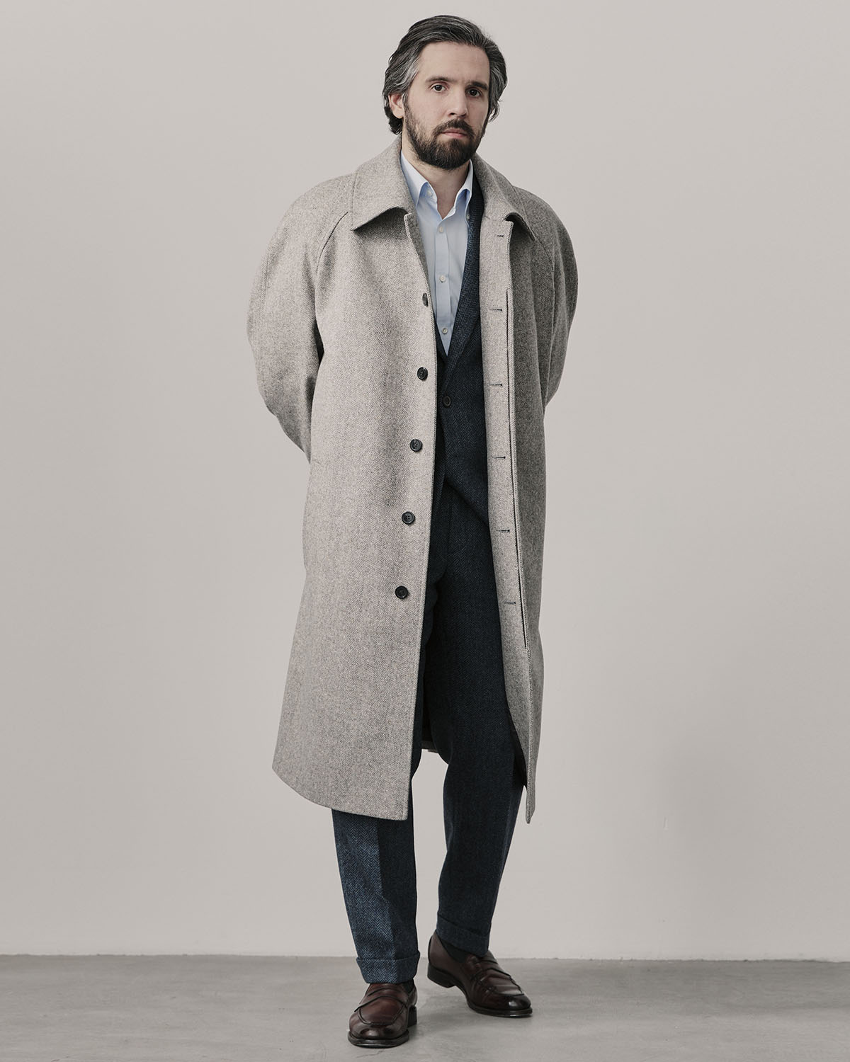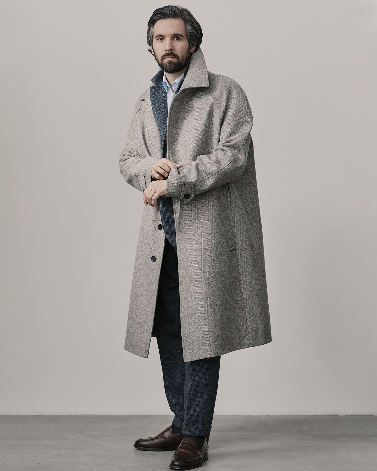 Лаконичный силуэт, минимум отвлекающих деталей, супатная застежка, пуговицы спрятаны внутри. Рукав реглан позволяет вторым слоем надеть пиджак, свитер, стеганную жилетку.