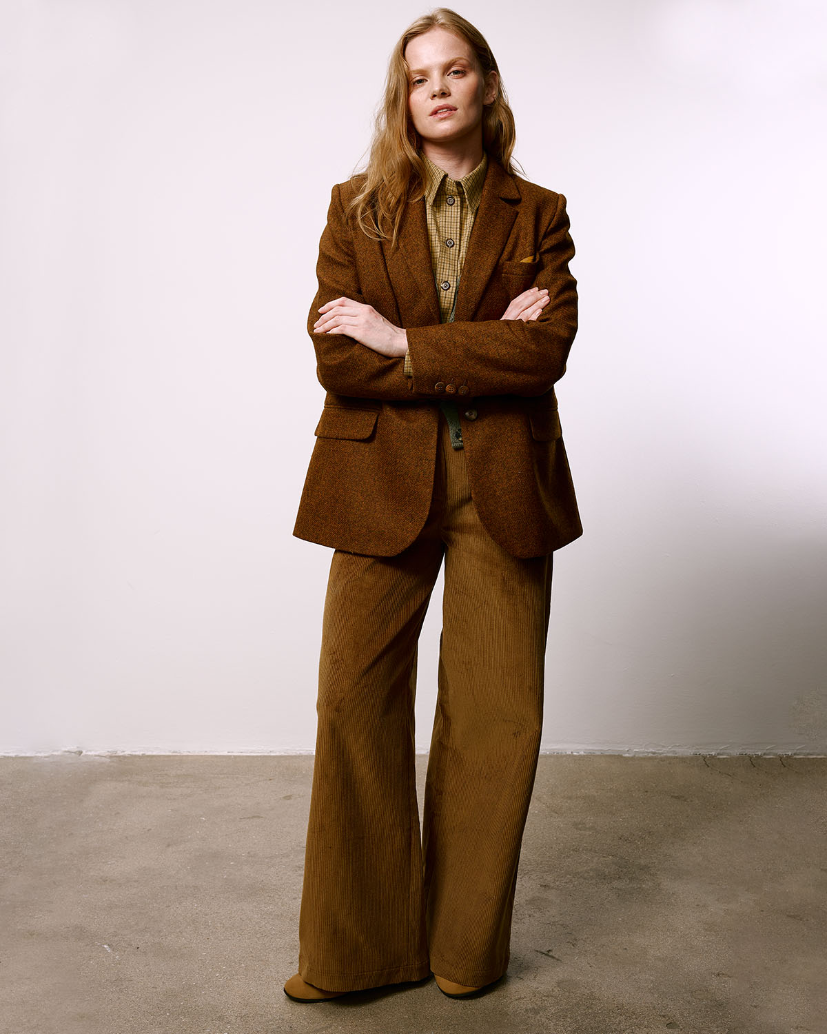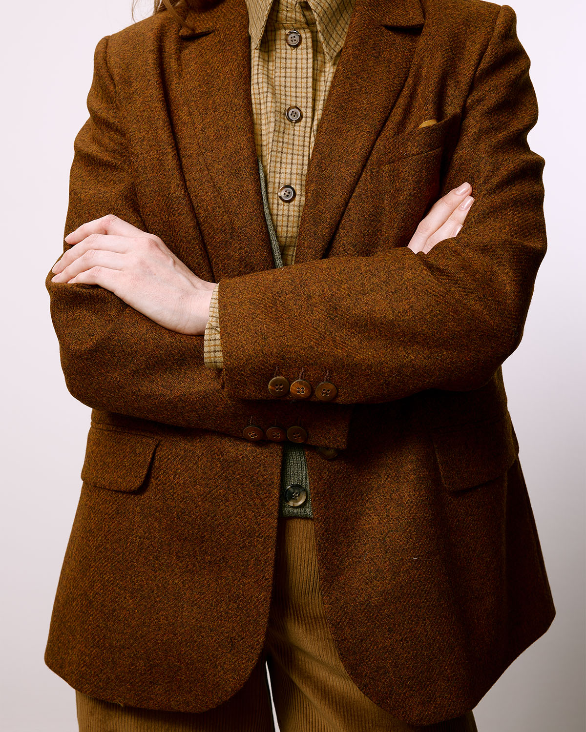 Классический женский твидовый пиджак от российского бренда Put It On. Сшит в Москве из костюмного твида, сотканного в Англии на фабрике Abraham Moon & Sons из шерсти овец шетландской породы. Подкладка выполнена из купро - премиальной шелковистой ткани от итальянской фабрики с более чем вековой историей. Пуговицы изготовлены из натурального рога на небольшой мануфактуре в Германии.