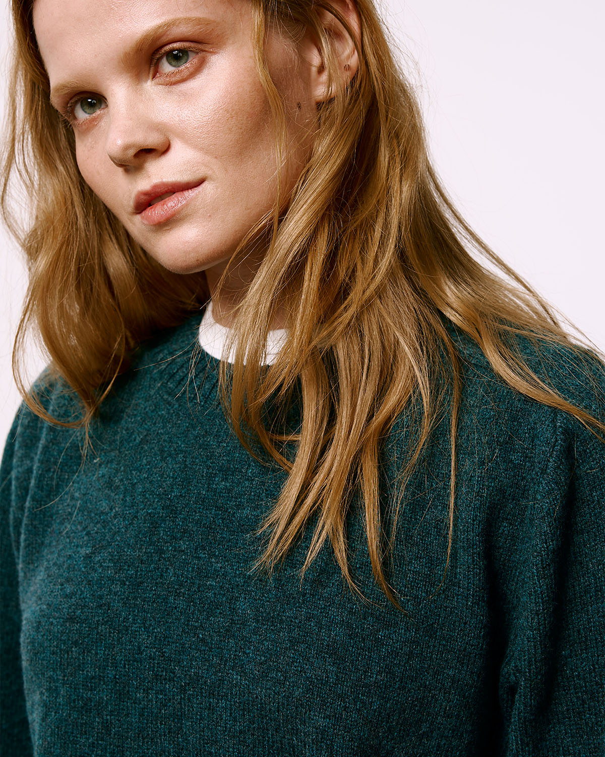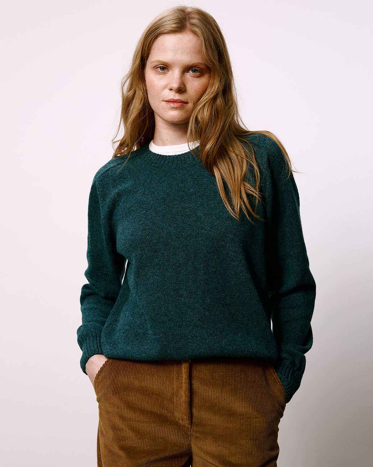 Классический базовый джемпер из меланжевой пряжи глубоких тёмно-бирюзовых и зелёных тонов. Связан в Москве, пряжа изготовлена из очень мягкой натуральной шерсти ягнёнка на одной из старейших фабрик Великобритании.