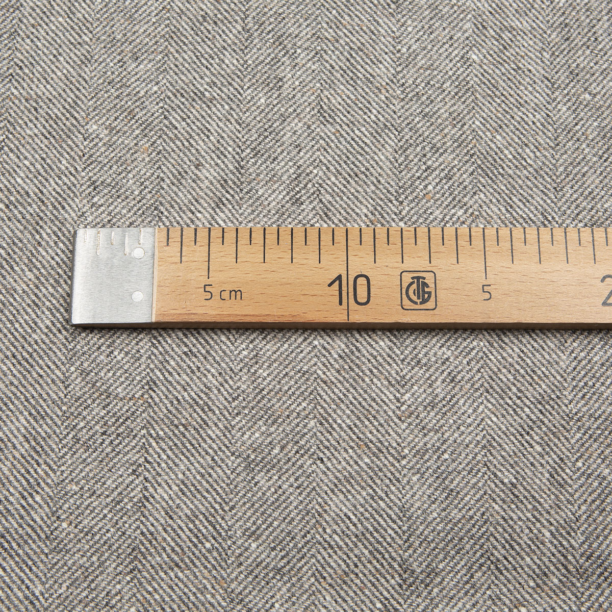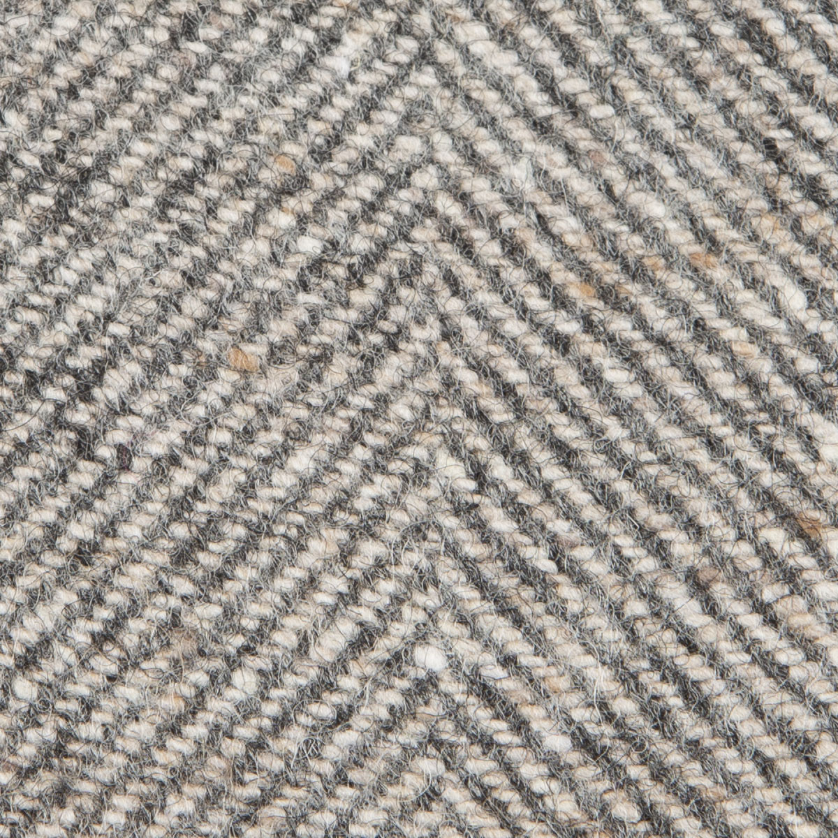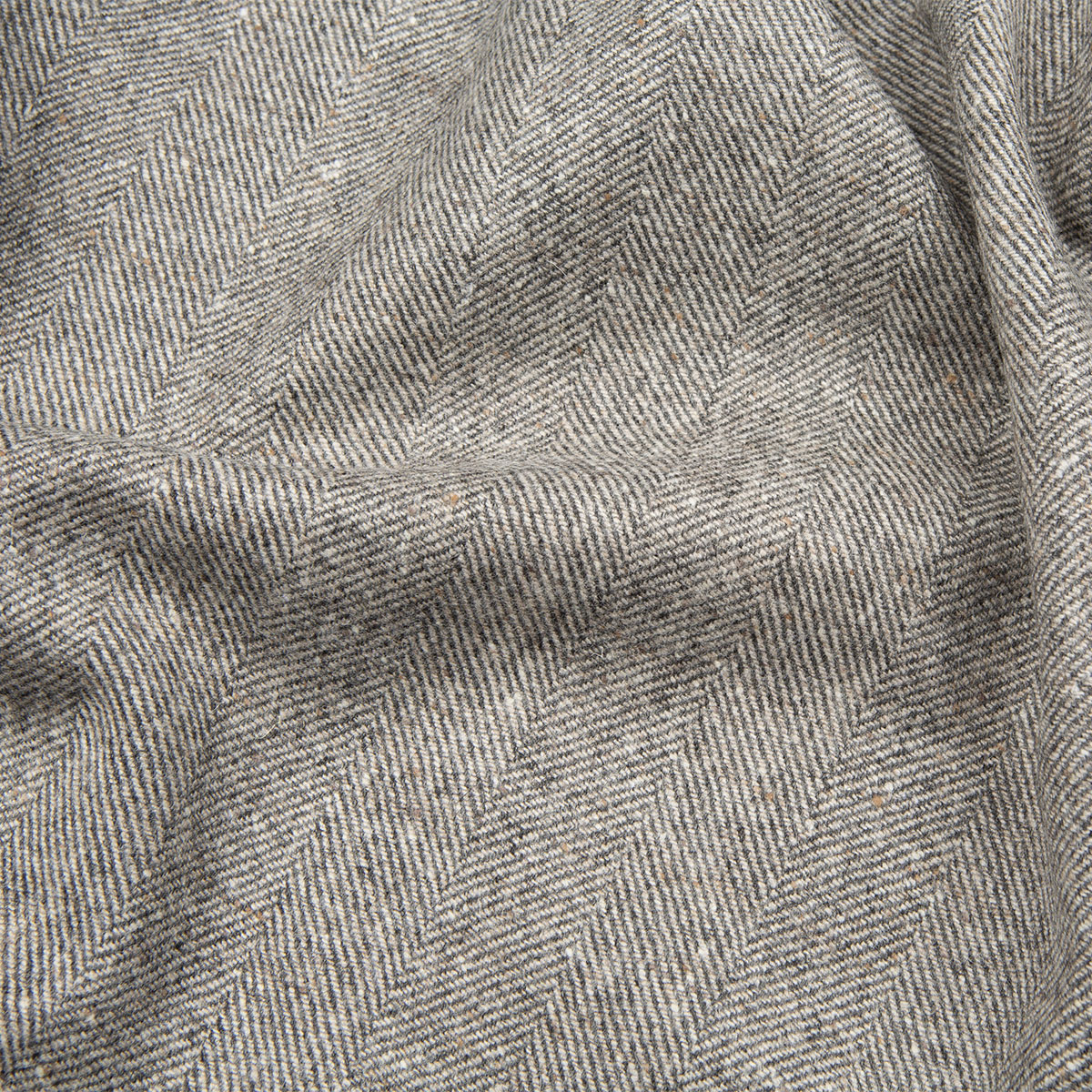 Плотная ткань с ткацким узором ёлочка (она же рыбья кость) в дымчато-серых и бежевых тонах с коричневыми вкраплениями. Соткана из натуральной шерсти шетландских овец.