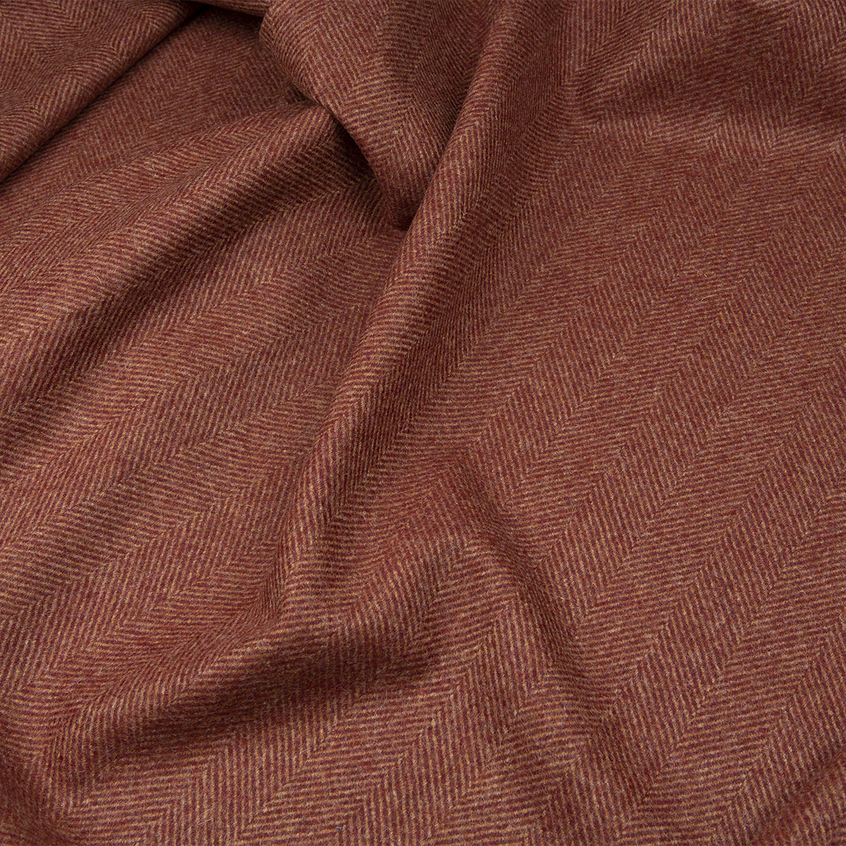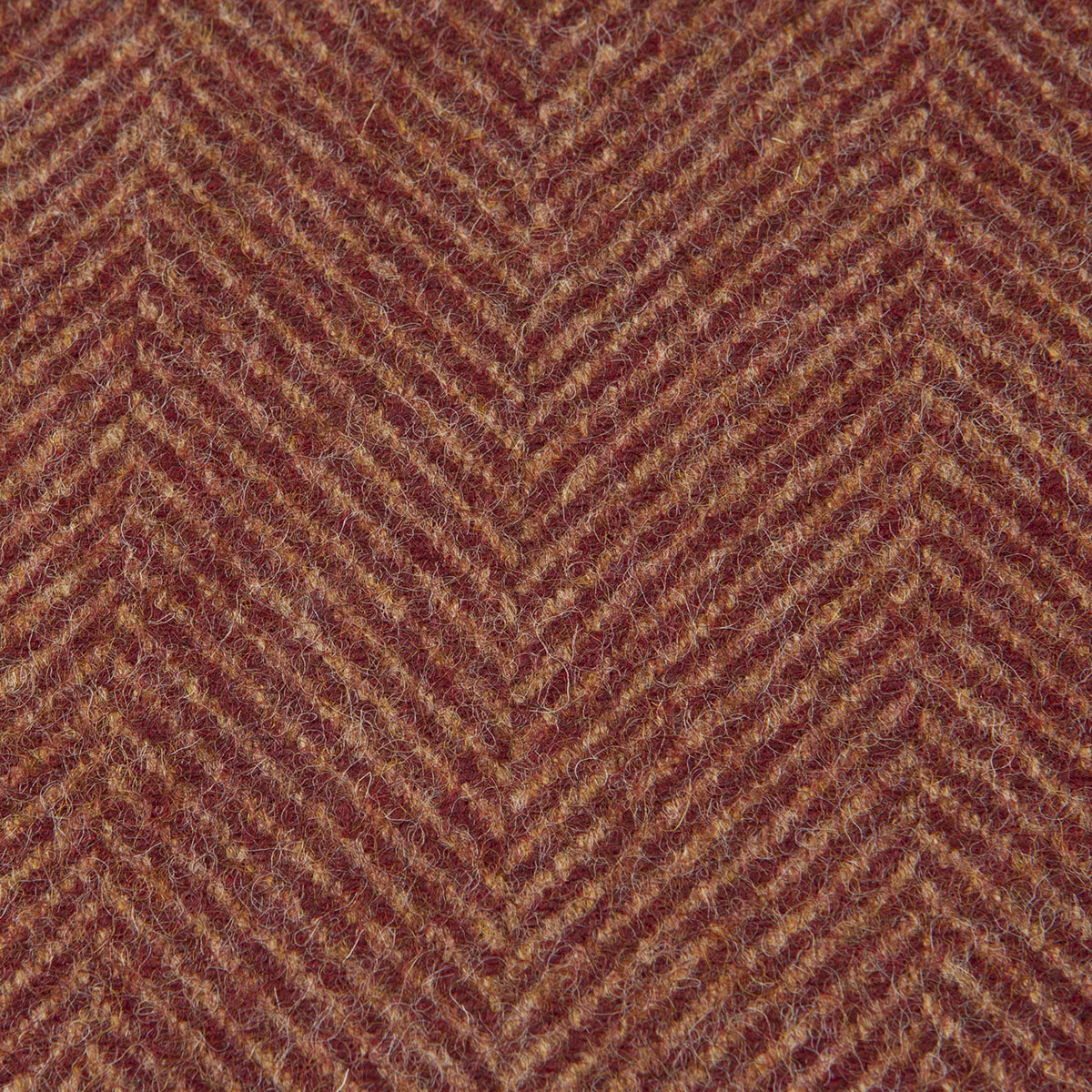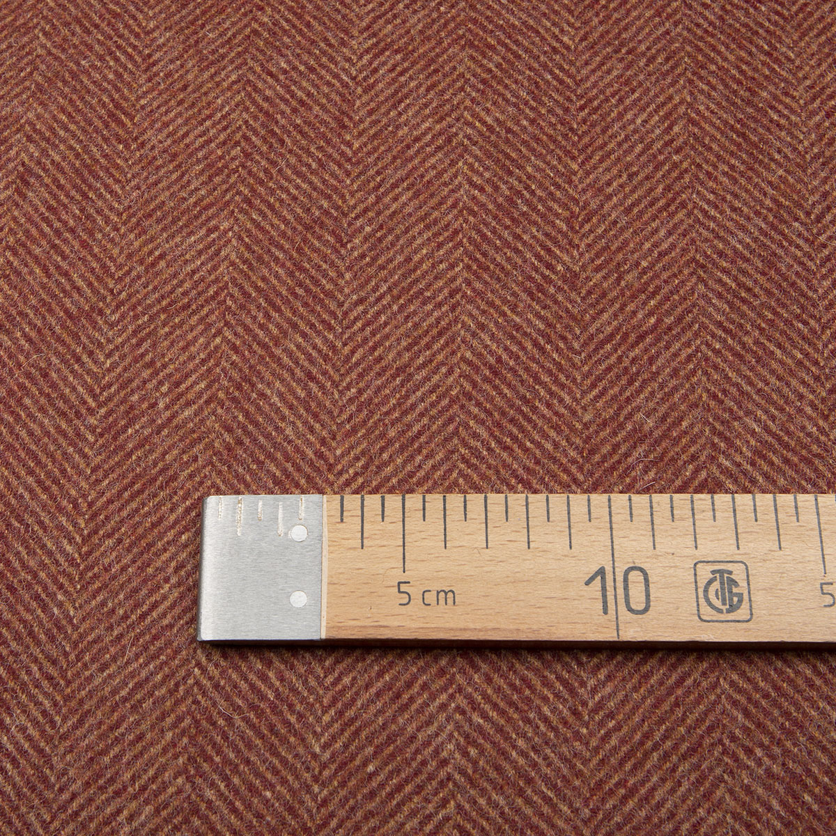 Плотная ткань с ткацким узором ёлочка (она же рыбья кость) в оранжево-красных тонах. Соткана из натуральной шерсти шетландских овец.